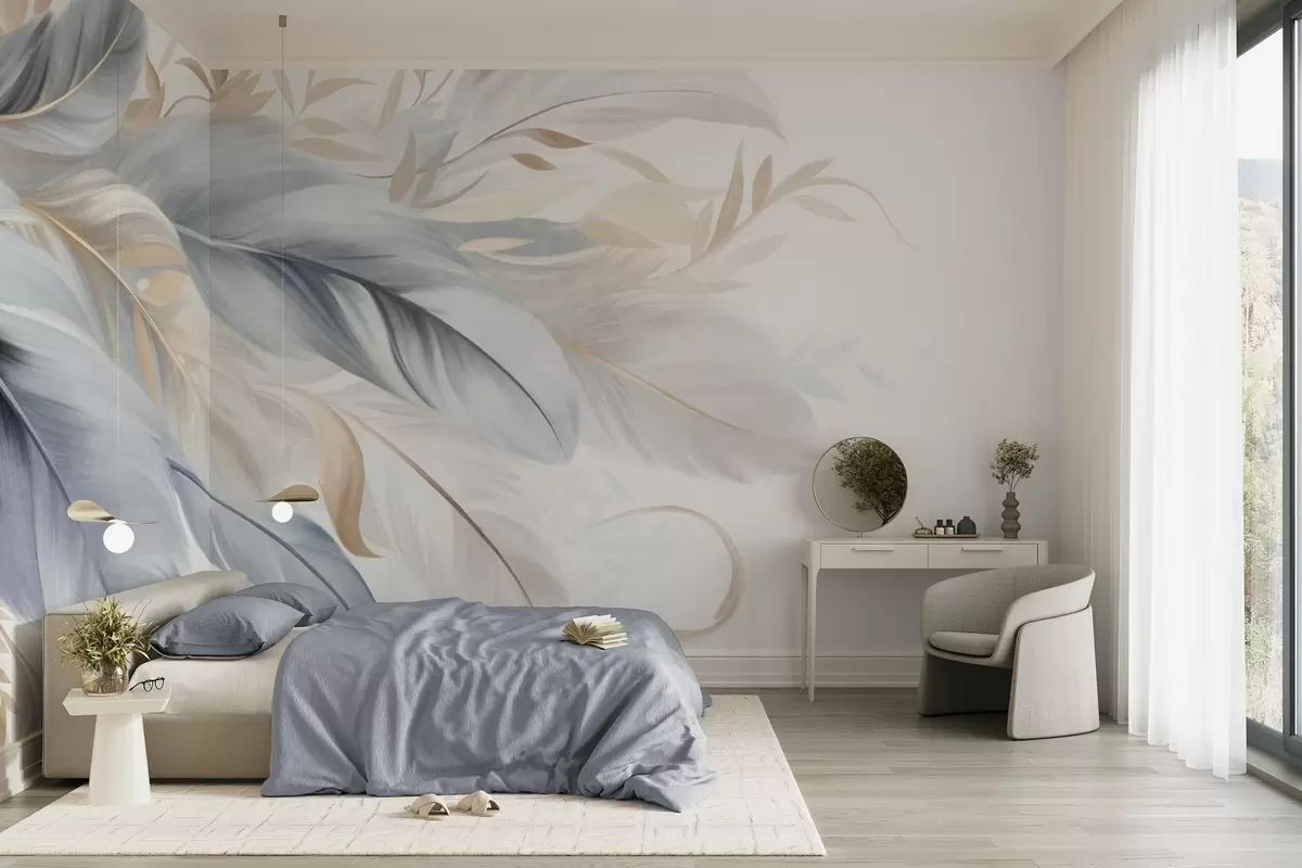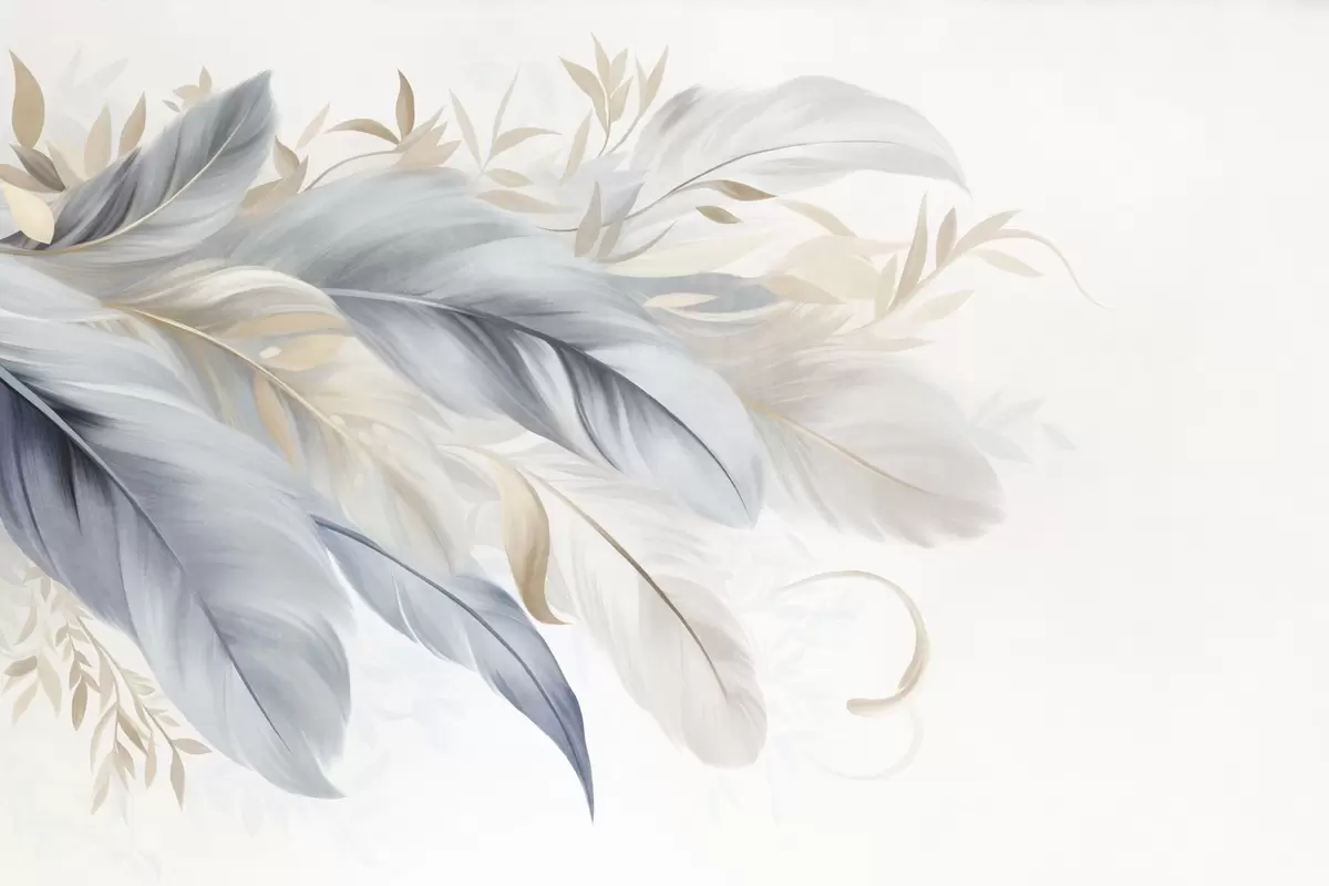 Murais de parede Penas texturizadas em tons pastel e folhas delicadas sobre um fundo claro Nr. w09763