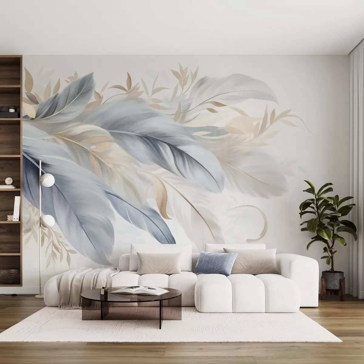 Murais de parede Penas texturizadas em tons pastel e folhas delicadas sobre um fundo claro Nr. w09763