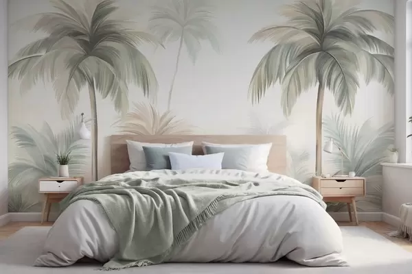 Murais de parede Palmeiras com folhagem texturada, em tons suaves de verde e bege, contra um céu claro Nr. w09770