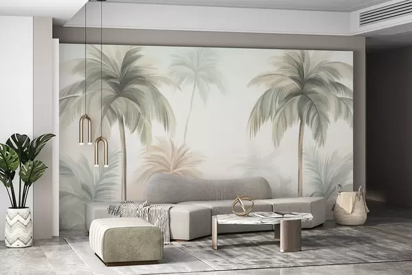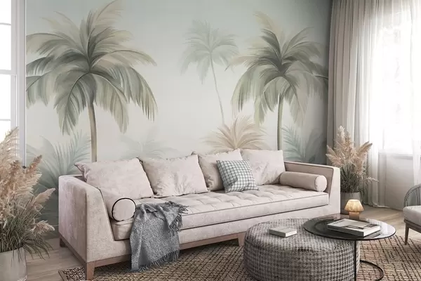 Murais de parede Palmeiras com folhagem texturada, em tons suaves de verde e bege, contra um céu claro Nr. w09770