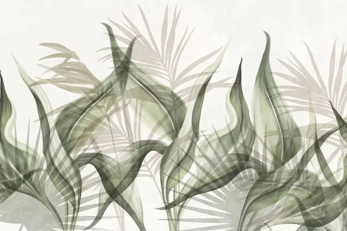 Murais de parede Folhas tropicais em tons de bege e verde contra um fundo branco, estilo aquarela texturizado Nr. w09772v1