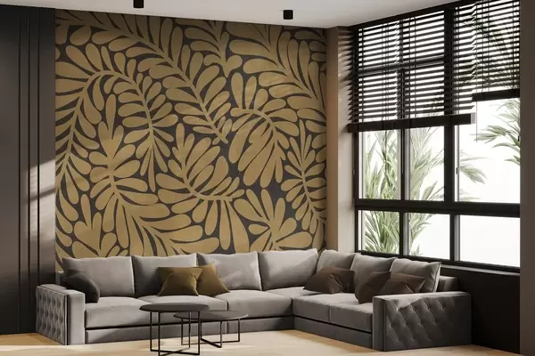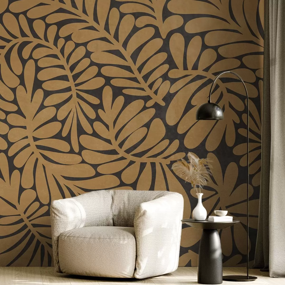 Murais de parede Folhas amarelo-mostarda estilizadas sobre um fundo cinzento escuro, obra de arte com textura Nr. w09775