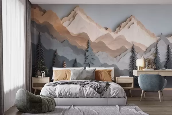 Murais de parede Paisagem natural com pinheiros e montanhas em estilo de madeira esculpida Nr. w09793