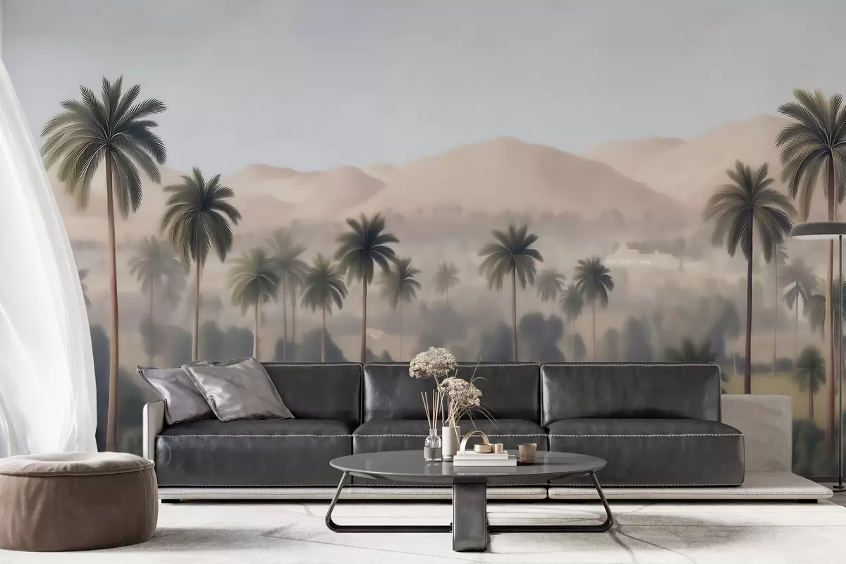 Murais de parede Paisagem tropical com palmeiras e montanhas, panorama vintage em tons de bege e verde Nr. w09798