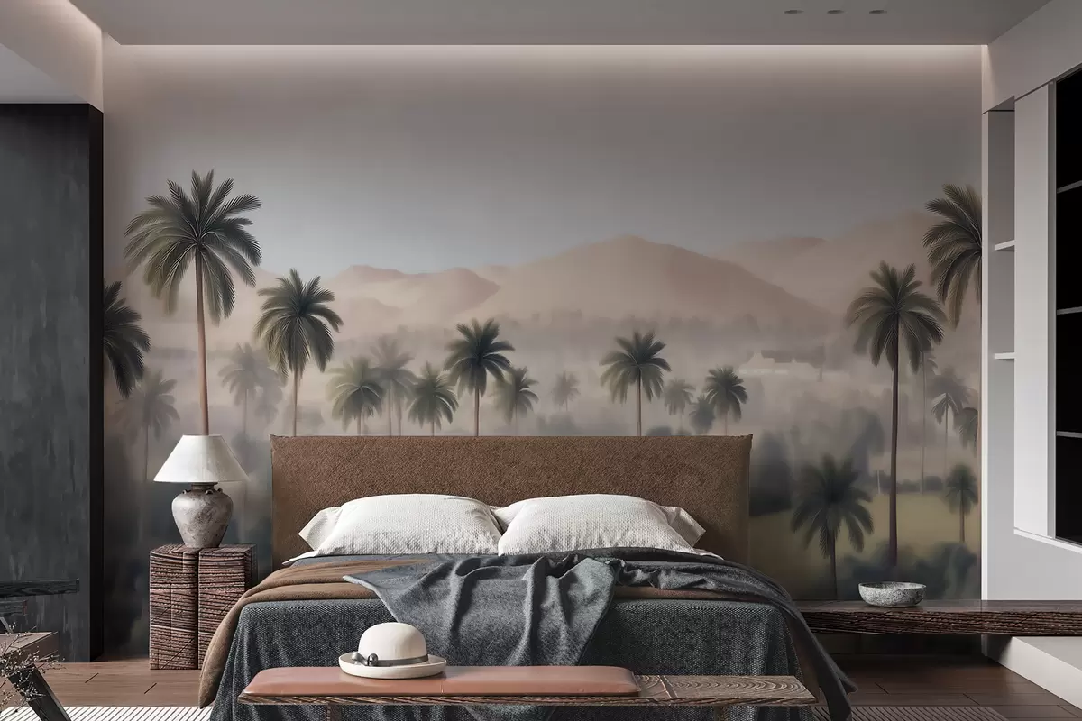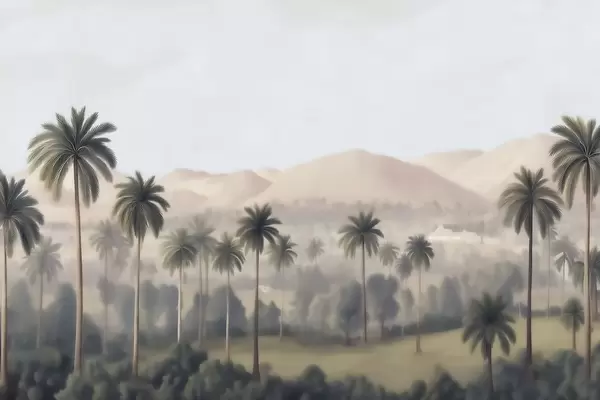 Murais de parede Paisagem tropical com palmeiras e montanhas, panorama vintage em tons de bege e verde Nr. w09798