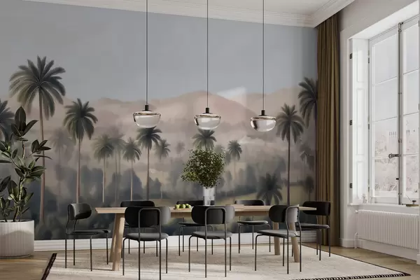 Murais de parede Paisagem tropical com palmeiras e montanhas, panorama vintage em tons de bege e verde Nr. w09798