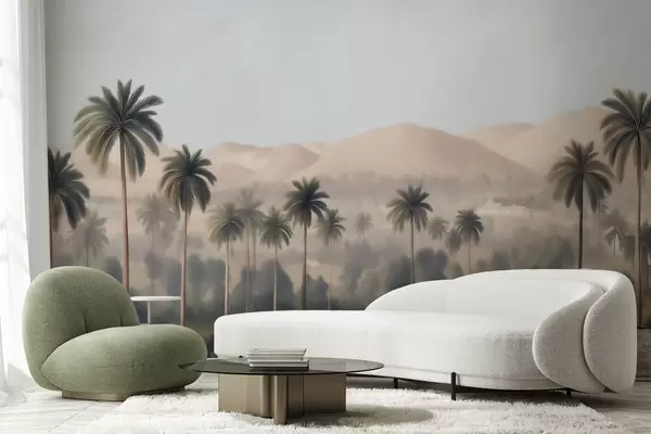 Murais de parede Paisagem tropical com palmeiras e montanhas, panorama vintage em tons de bege e verde Nr. w09798