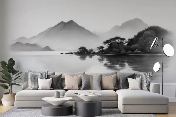 Murais de parede Paisagem a preto e branco com montanhas e um lago envoltos numa névoa suave Nr. w09803