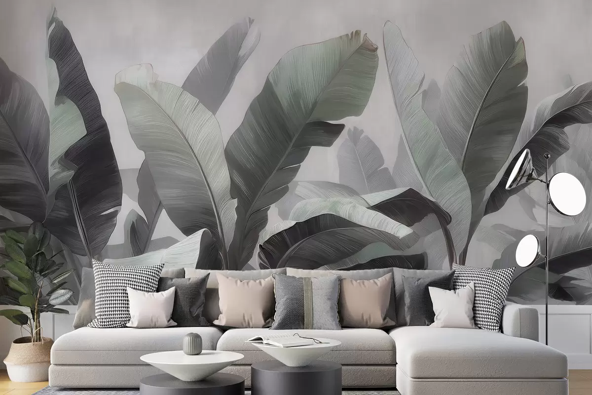 Murais de parede Folhas de bananeira grandes e abstratas, em tons suaves de cinzento-esverdeado, numa paleta neutra Nr. w09805