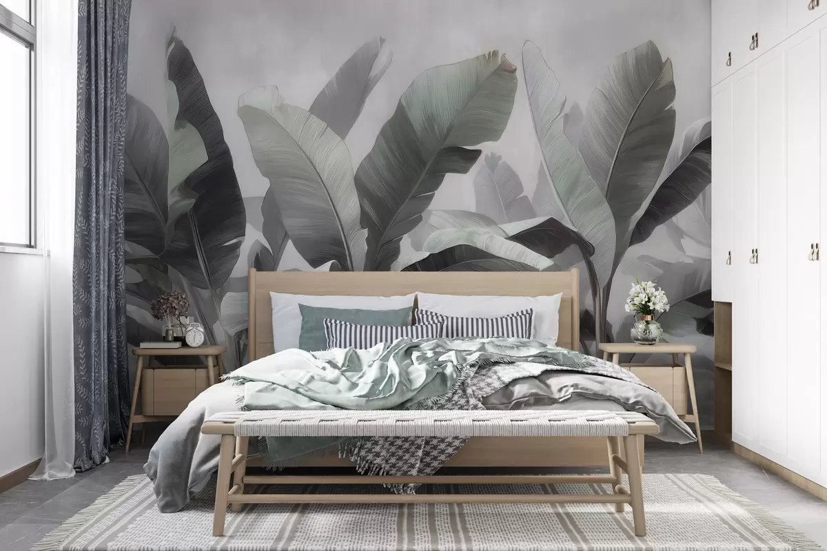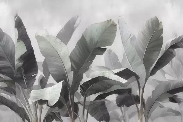 Murais de parede Folhas de bananeira grandes e abstratas, em tons suaves de cinzento-esverdeado, numa paleta neutra Nr. w09805