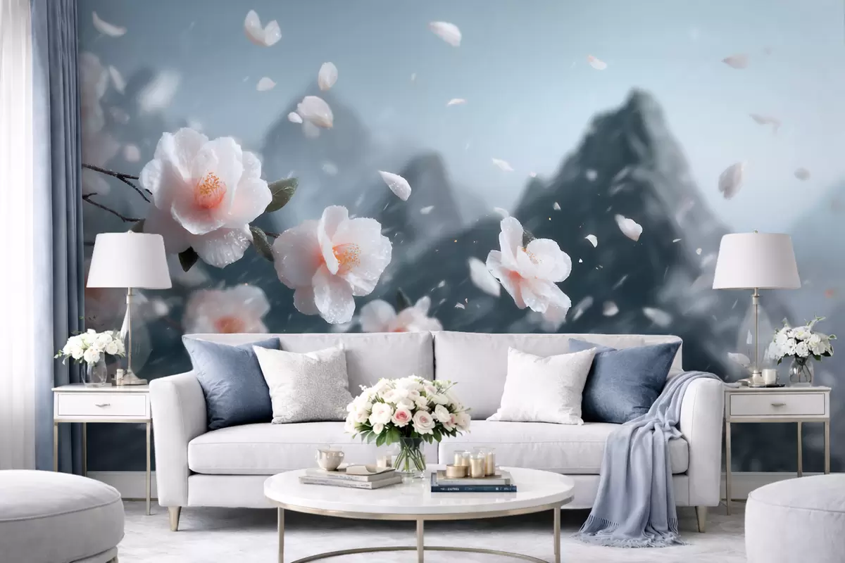 Murais de parede Delicadas flores de cerejeira em flor com as montanhas ao fundo, uma paisagem japonesa evocativa em tons pastel Nr. w09808