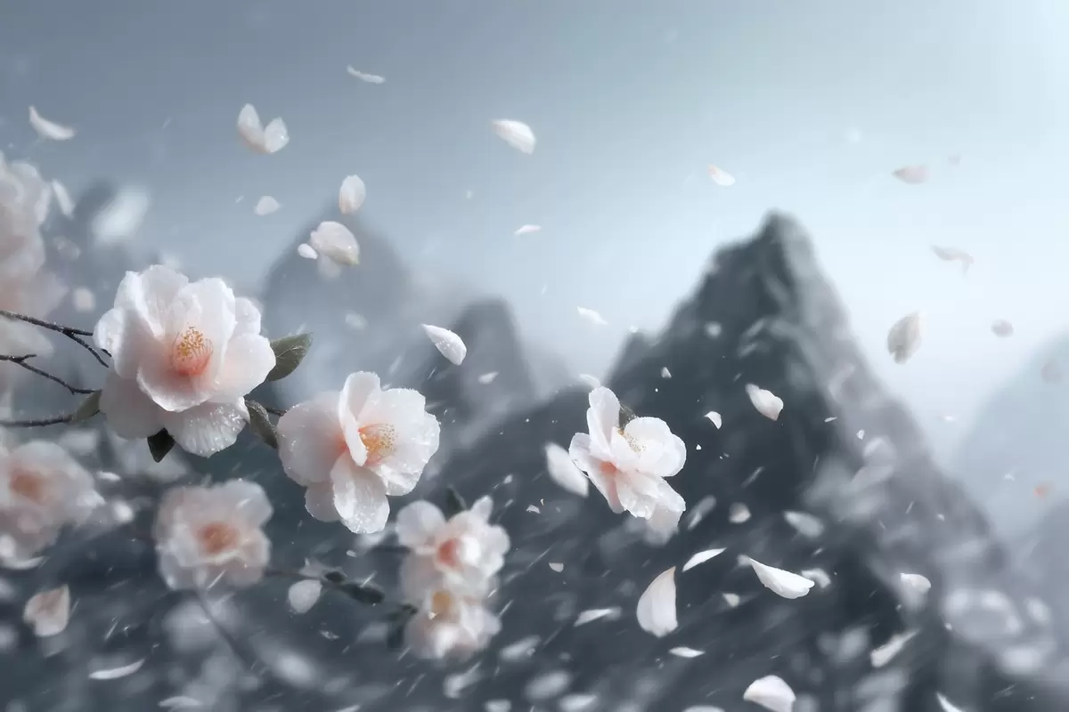 Murais de parede Delicadas flores de cerejeira em flor com as montanhas ao fundo, uma paisagem japonesa evocativa em tons pastel Nr. w09808