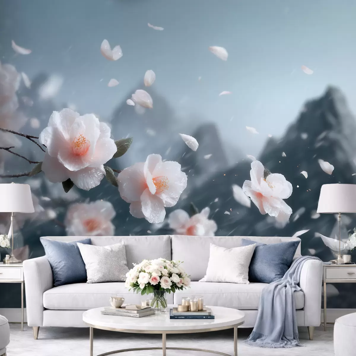 Murais de parede Delicadas flores de cerejeira em flor com as montanhas ao fundo, uma paisagem japonesa evocativa em tons pastel Nr. w09808