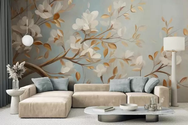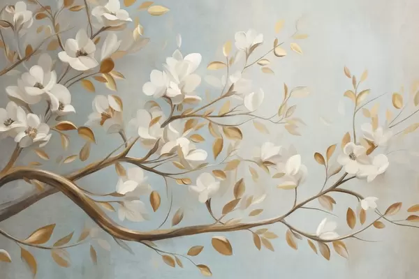 Murais de parede Galho de árvore texturado com flores brancas e folhas amarelas, estilo vintage Nr. w09814