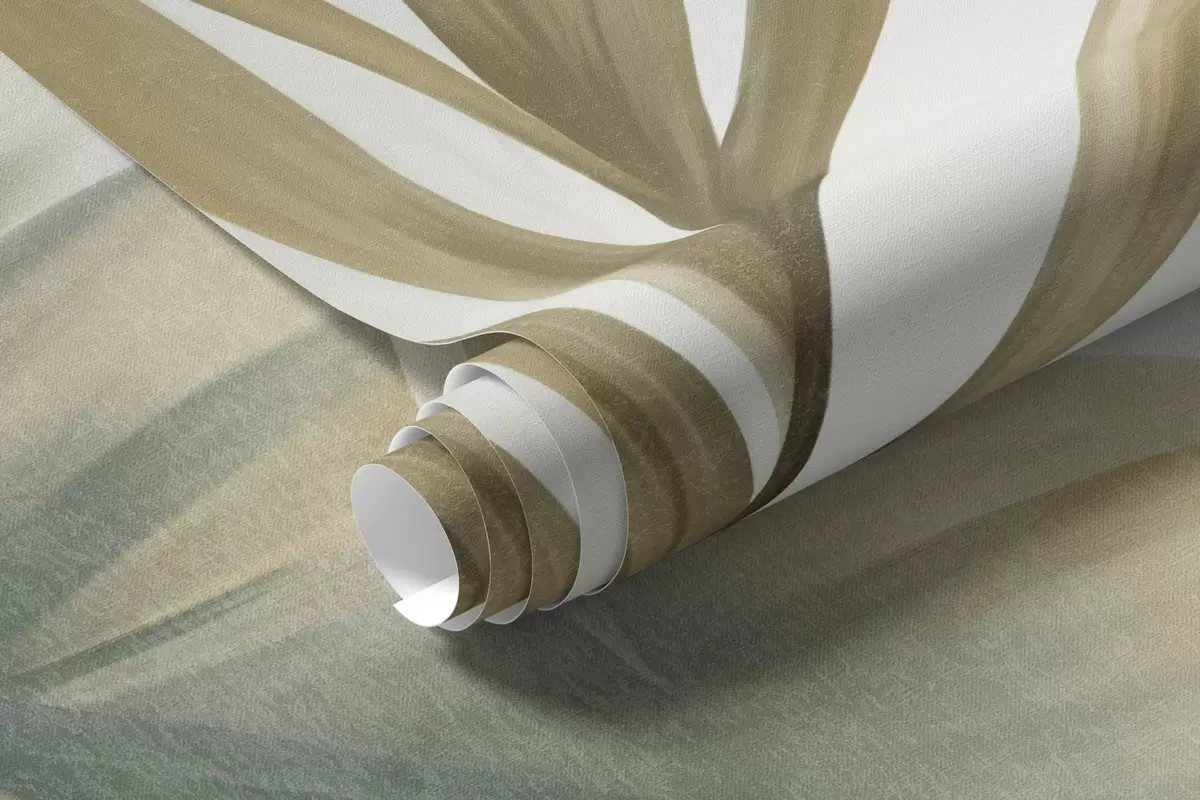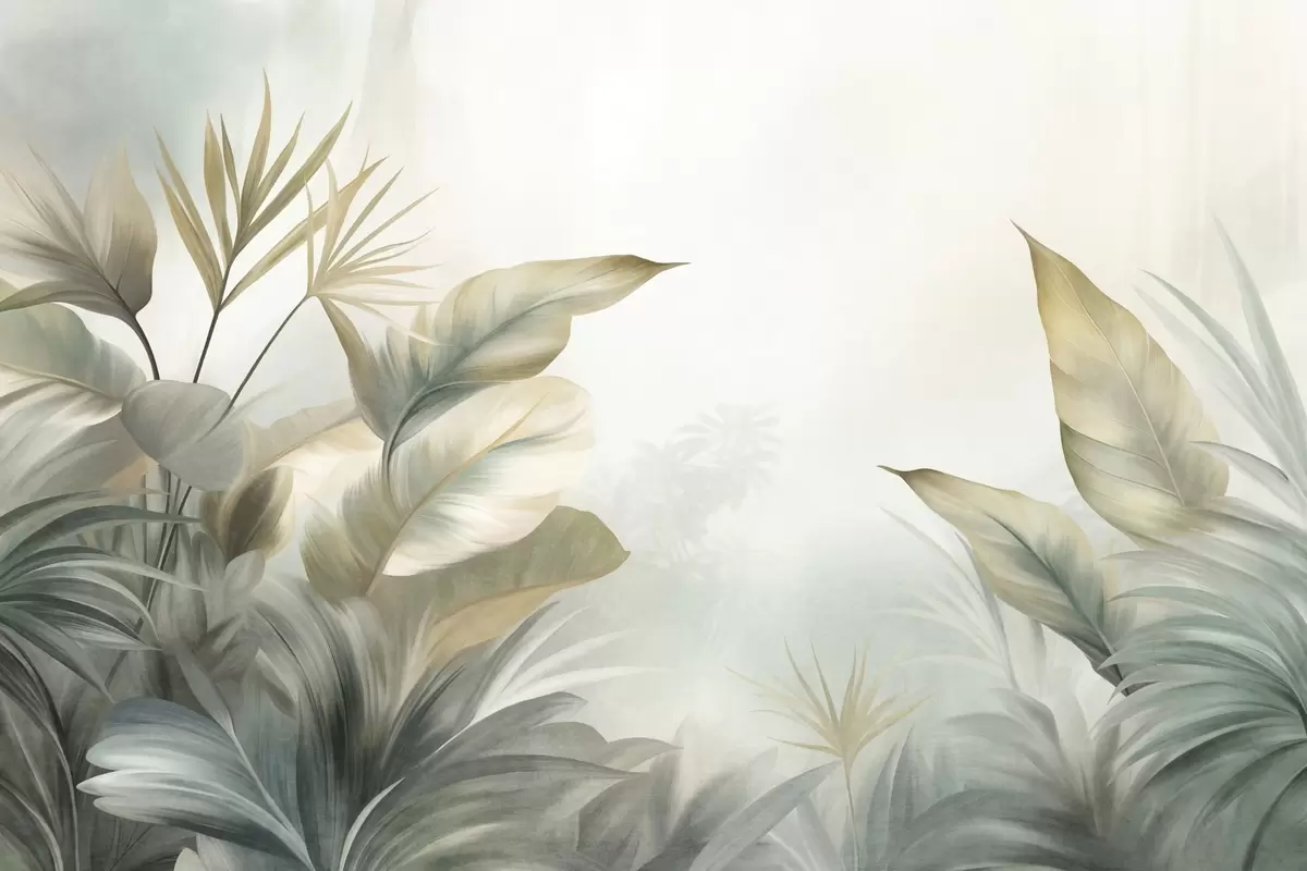 Murais de parede Folhas tropicais grandes e texturadas em tons suaves de verde e bege, num ambiente de selva Nr. w09820