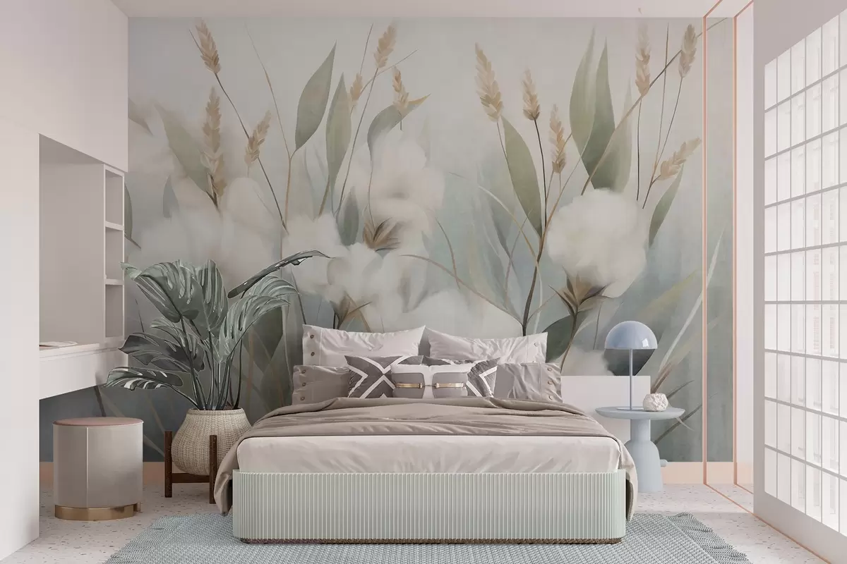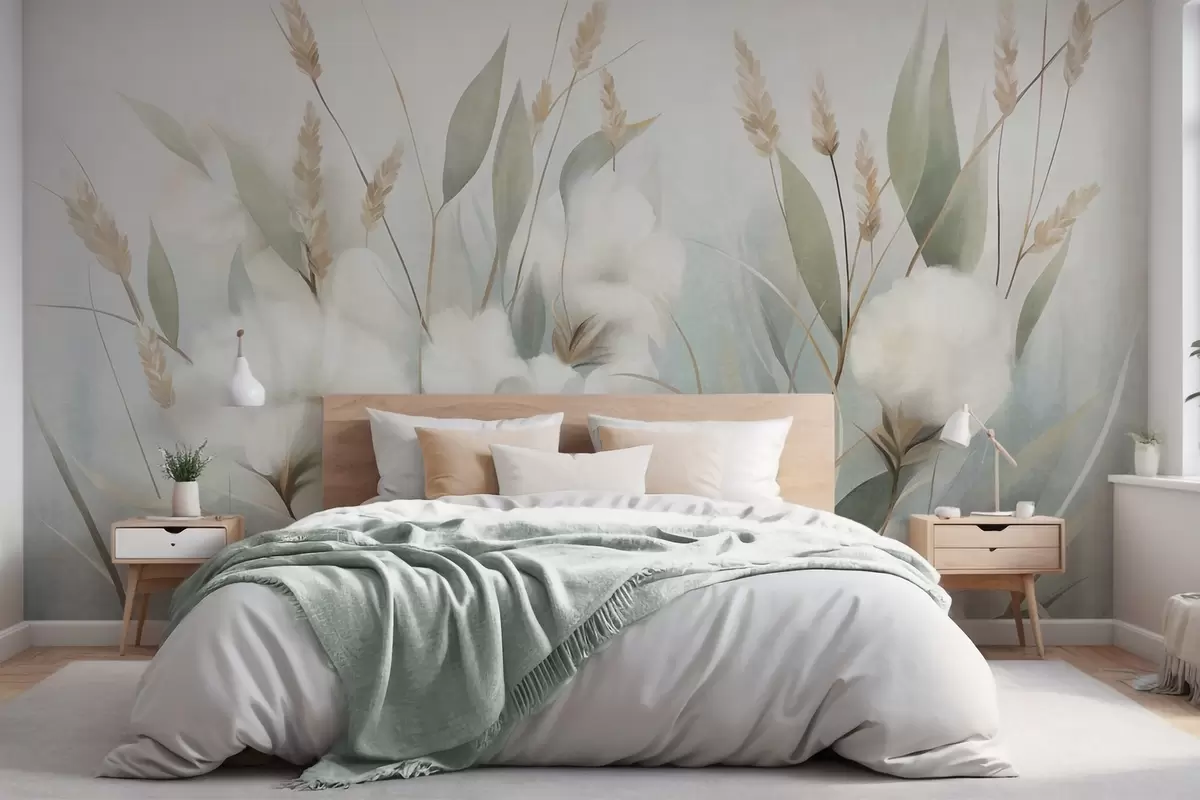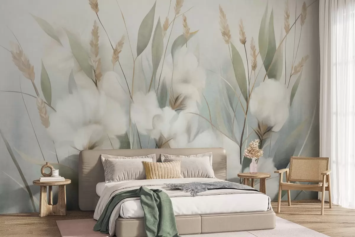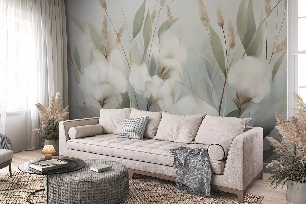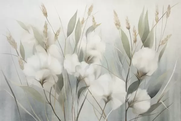 Murais de parede Flores secas brancas e ervas altas sobre um fundo suave e discreto, pintadas em estilo impressionista Nr. w09823