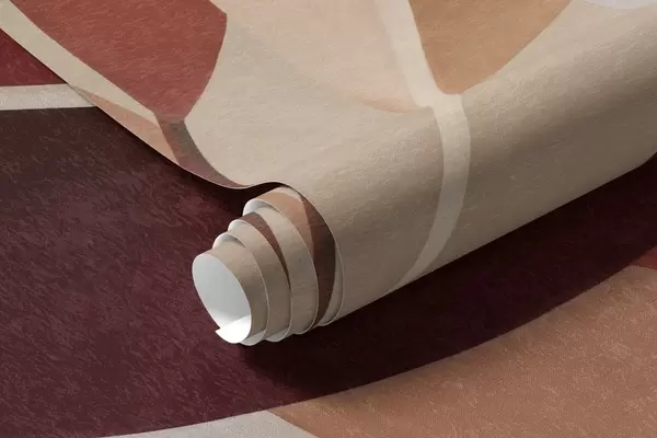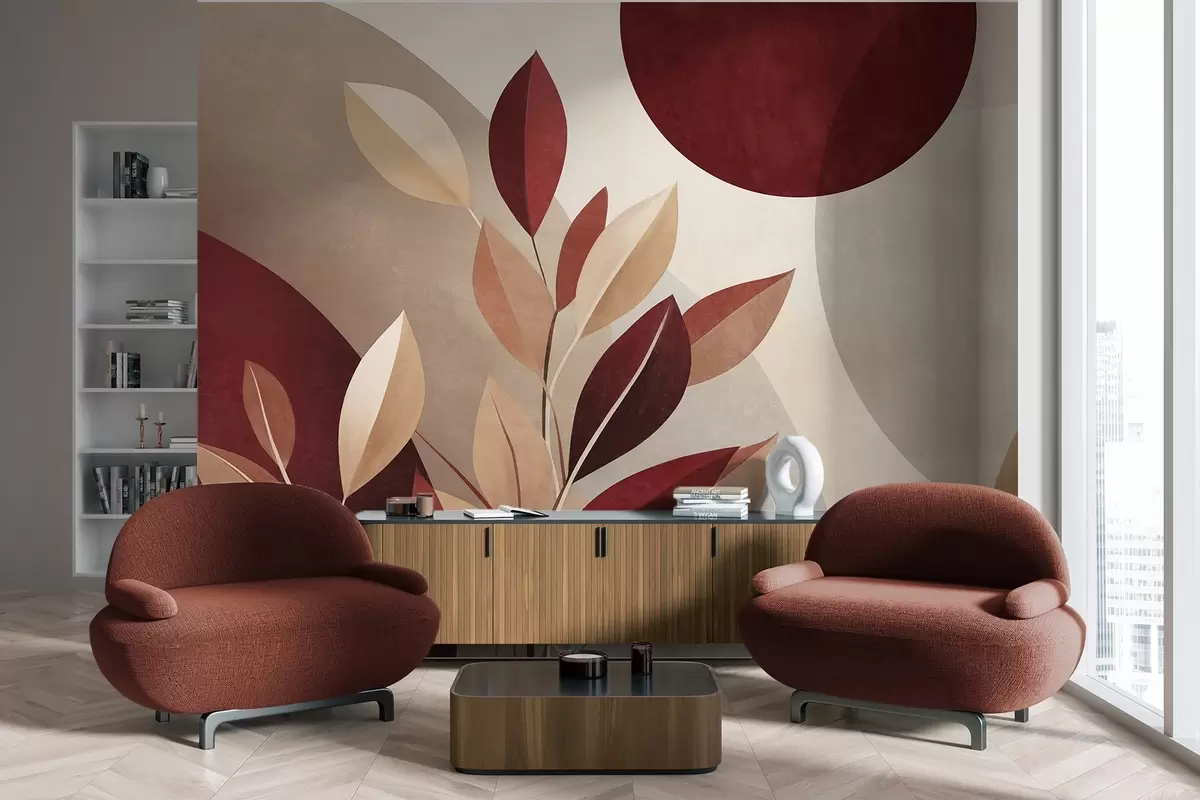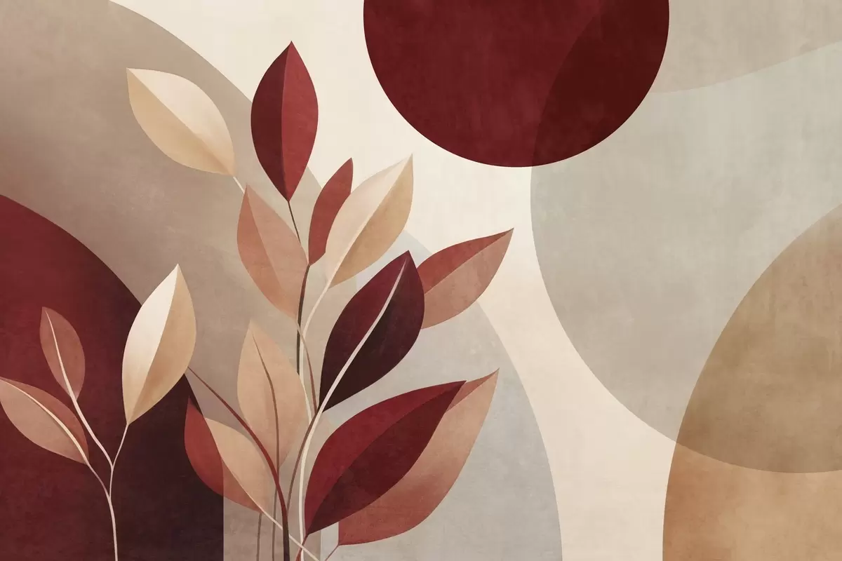 Murais de parede Folhas texturizadas em tons de bordô e bege sobre um fundo de formas abstratas, minimalismo, arte moderna Nr. w09829