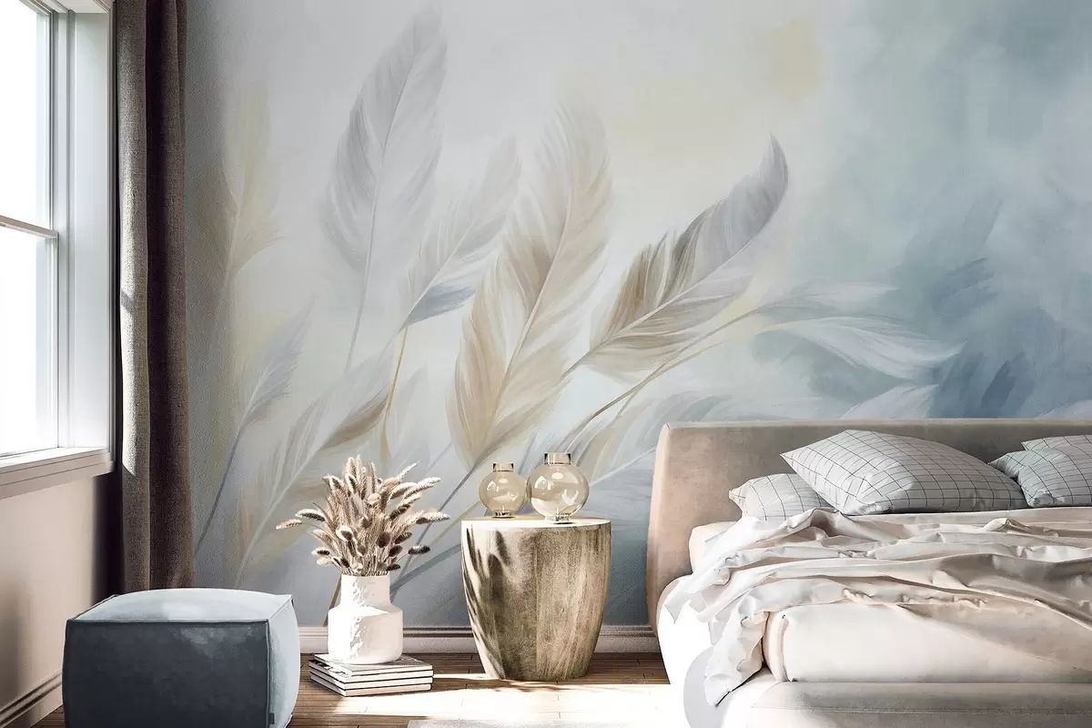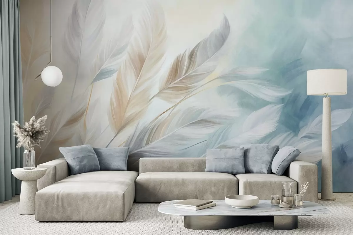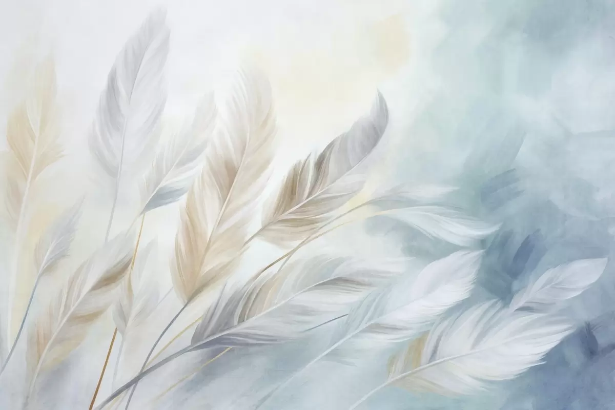Murais de parede Penas em tons pastel com textura e contornos suaves e esbatidos, sobre um fundo em estilo aquarela Nr. w09833
