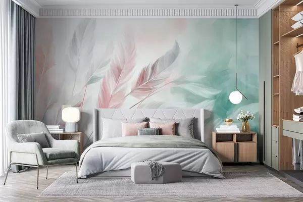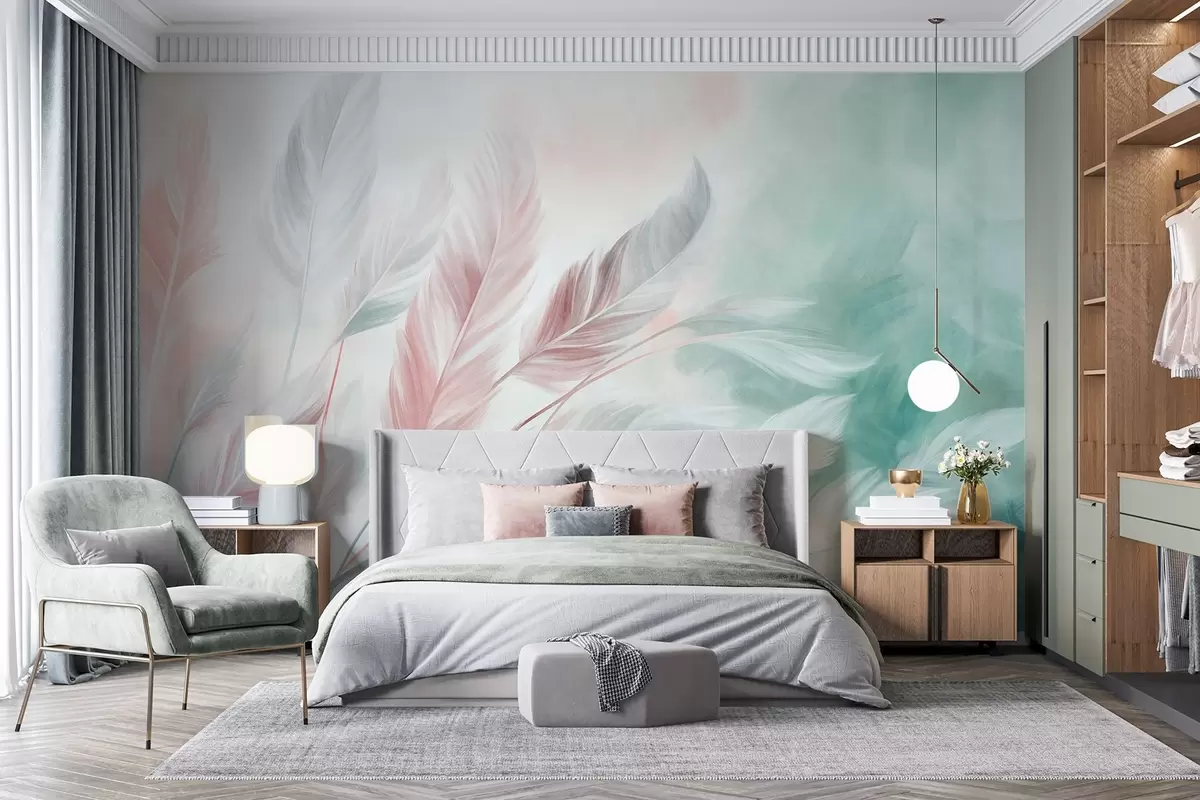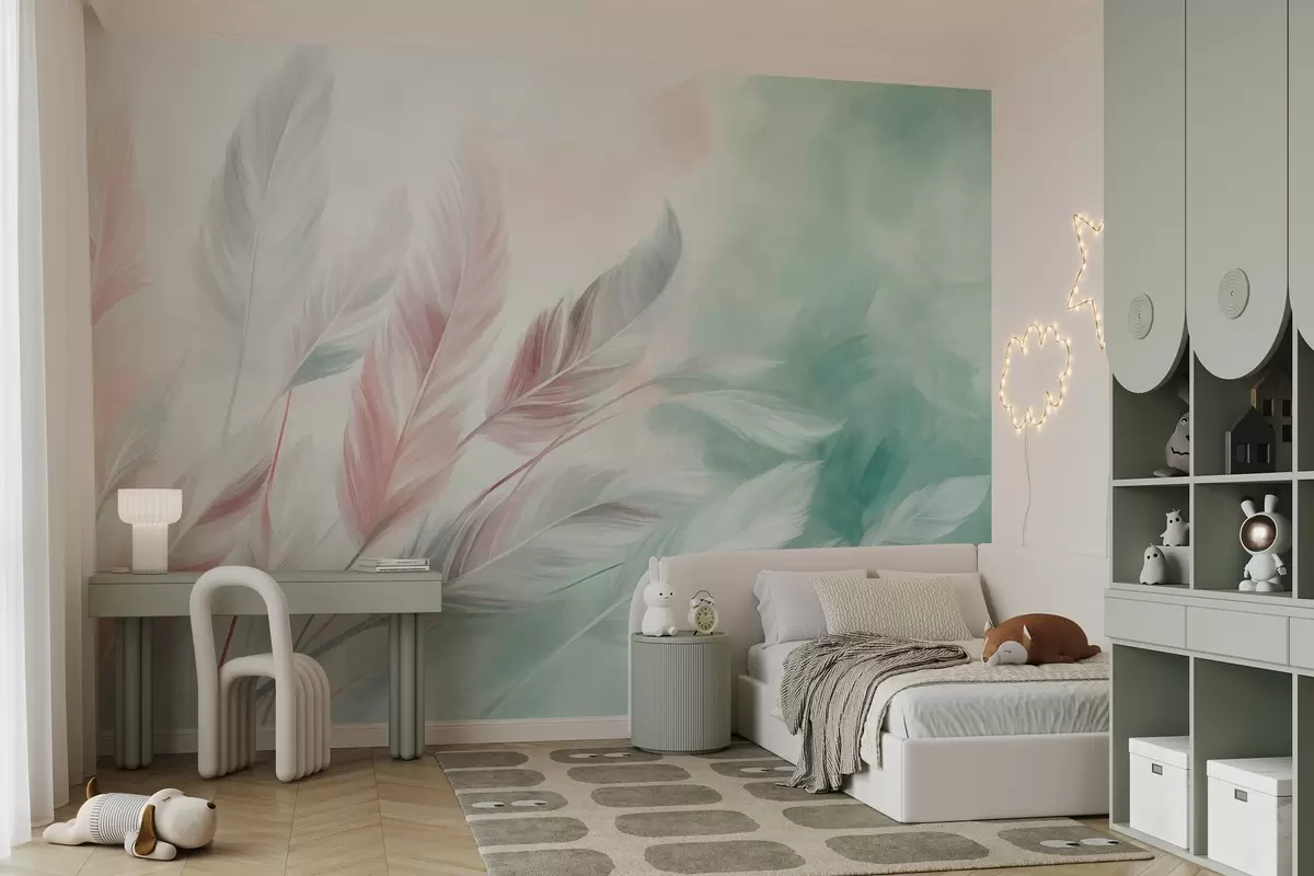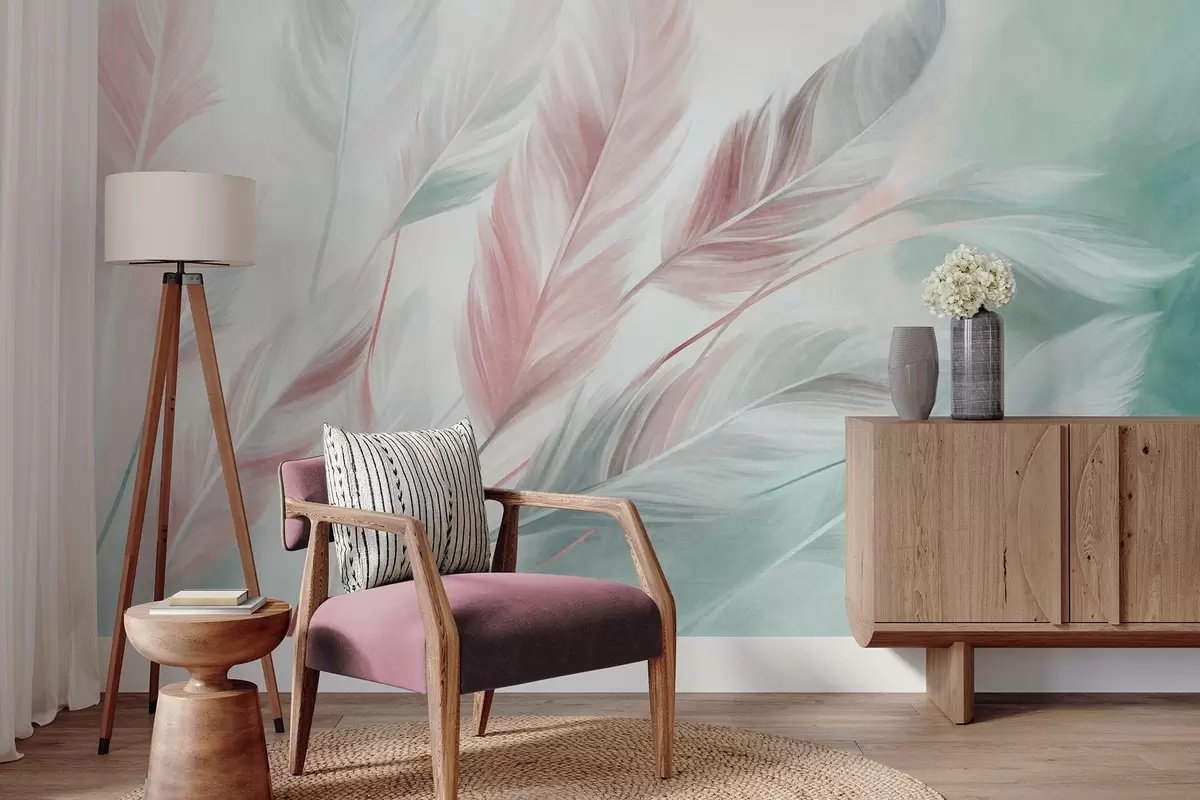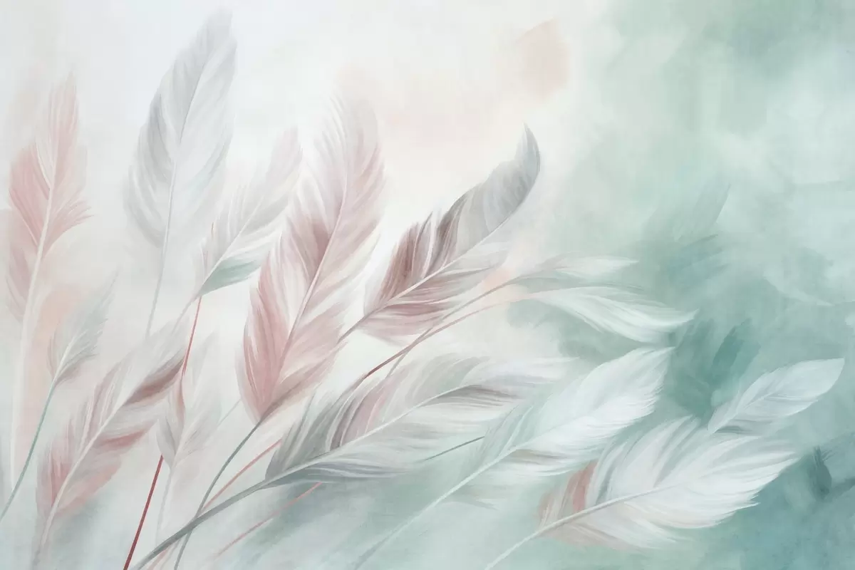 Murais de parede Penas em tons pastel com textura e contornos suaves e esbatidos, sobre um fundo em estilo aquarela Nr. w09833v1