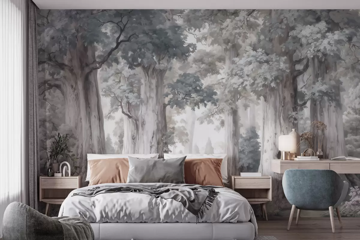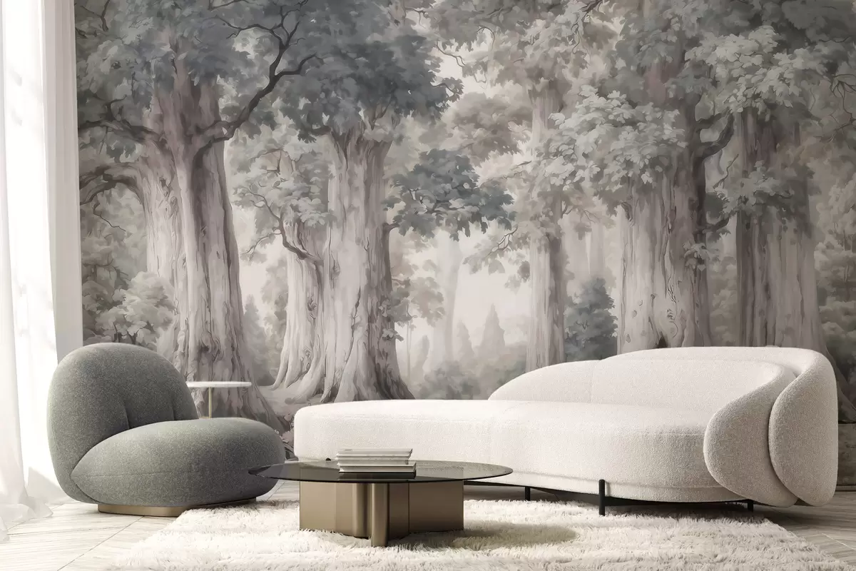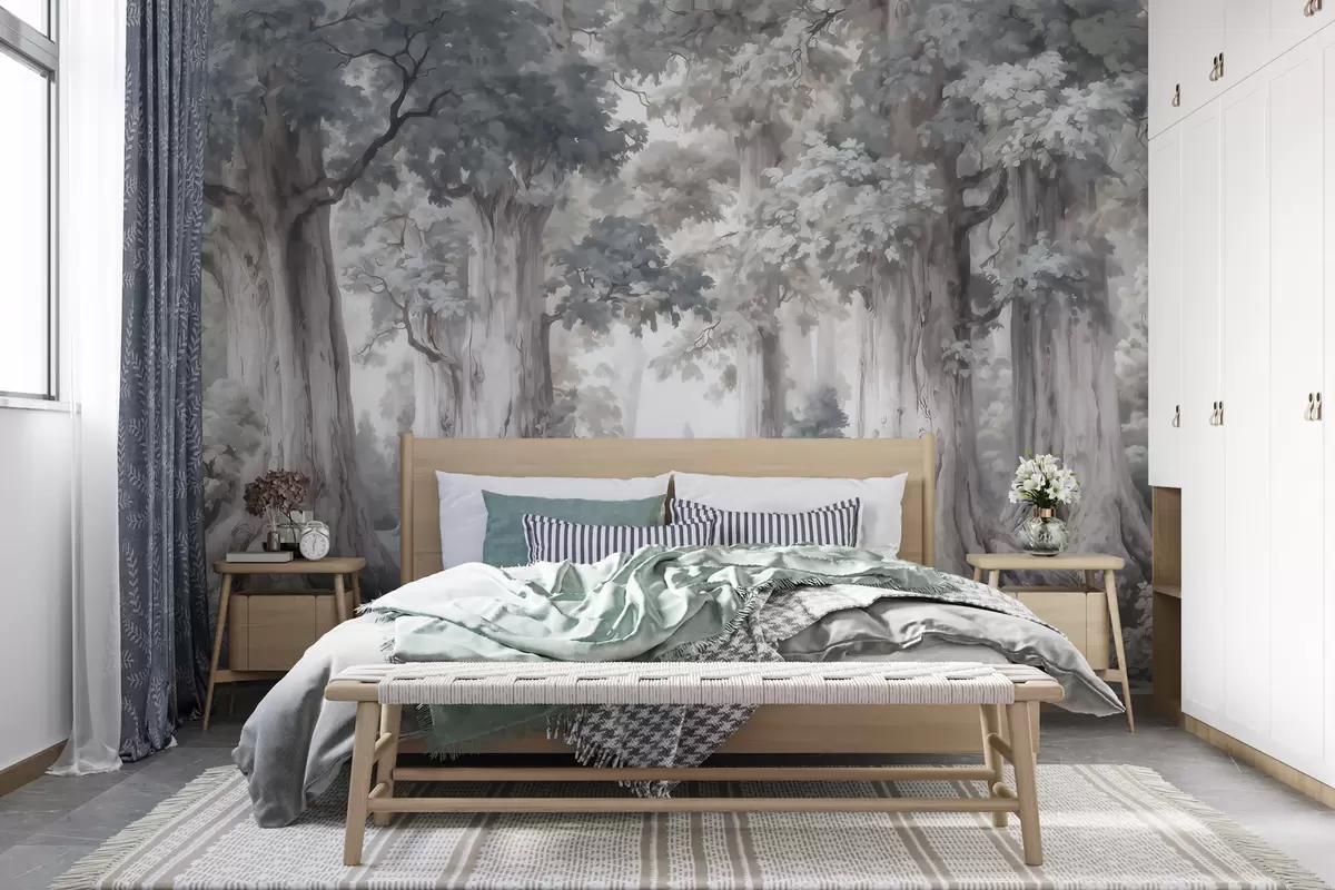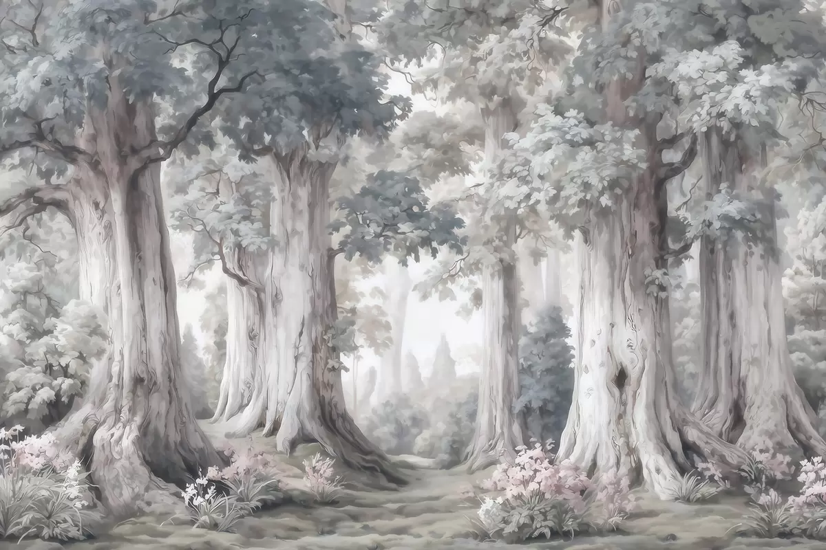Murais de parede Uma floresta de conto de fadas com árvores altas e uma paleta de cores suaves e discretas, ao estilo da aguarela Nr. w09849