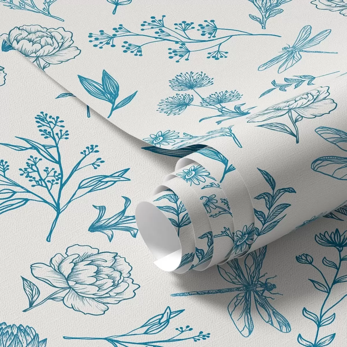 Papel de parede Flores azuis, folhas e libélulas sobre fundo branco Nr. a00025