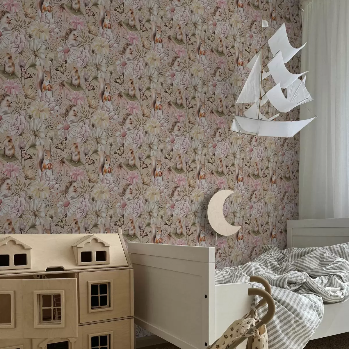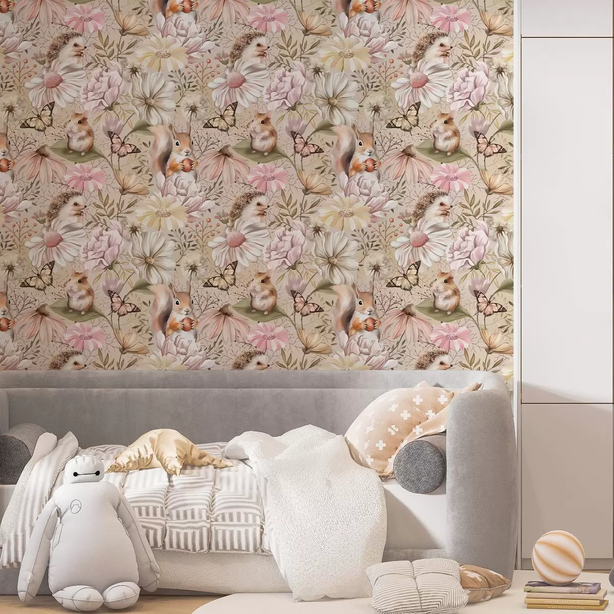 Papel de parede Ouriço, esquilo, hamster e borboletas com flores em tons pastel Nr. a00051