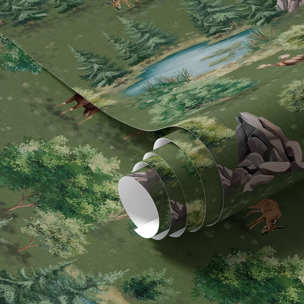 Papel de parede Veado junto ao lago com árvores e rochas Nr. a00086