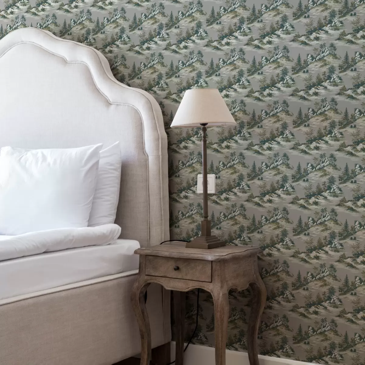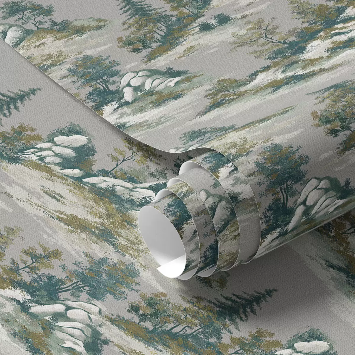 Papel de parede Árvores em saliências montanhosas com pedras sobre fundo cinzento Nr. a00090v1