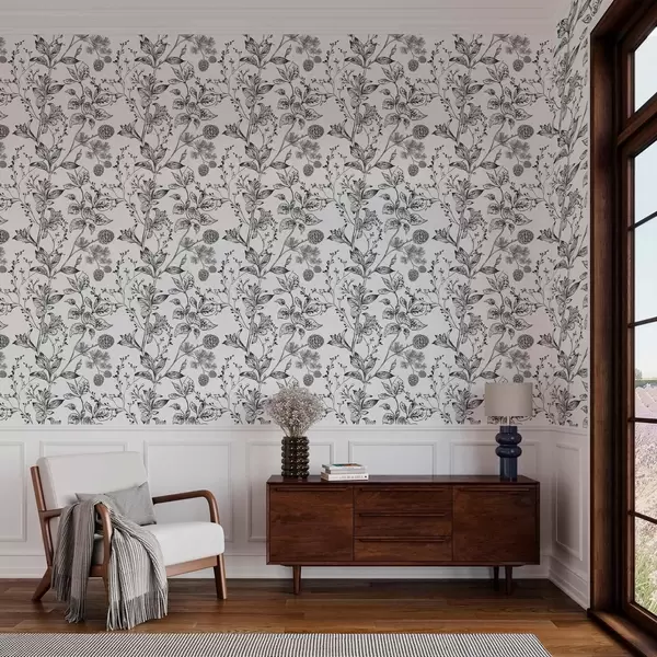 Papel de parede Ramos a preto e branco com folhas sobre fundo branco Nr. a00098v1