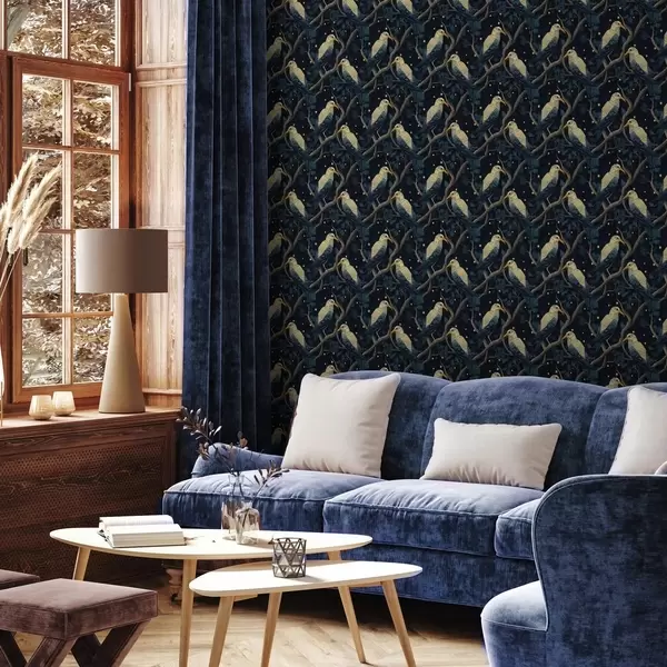 Papel de parede Aves nocturnas em ramos e estrelas sobre um fundo azul escuro Nr. a00109v1