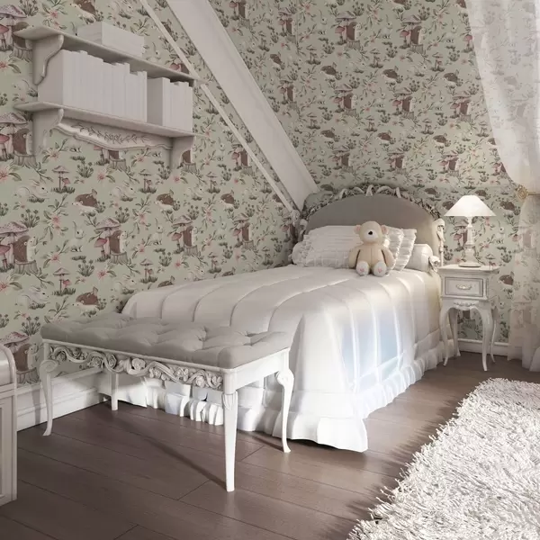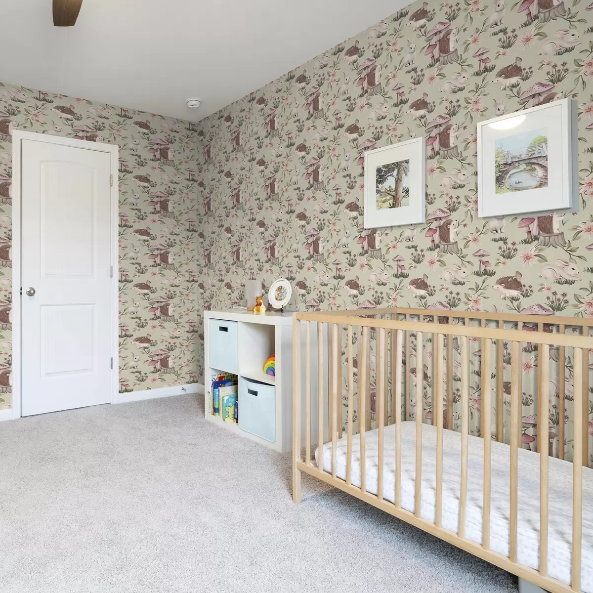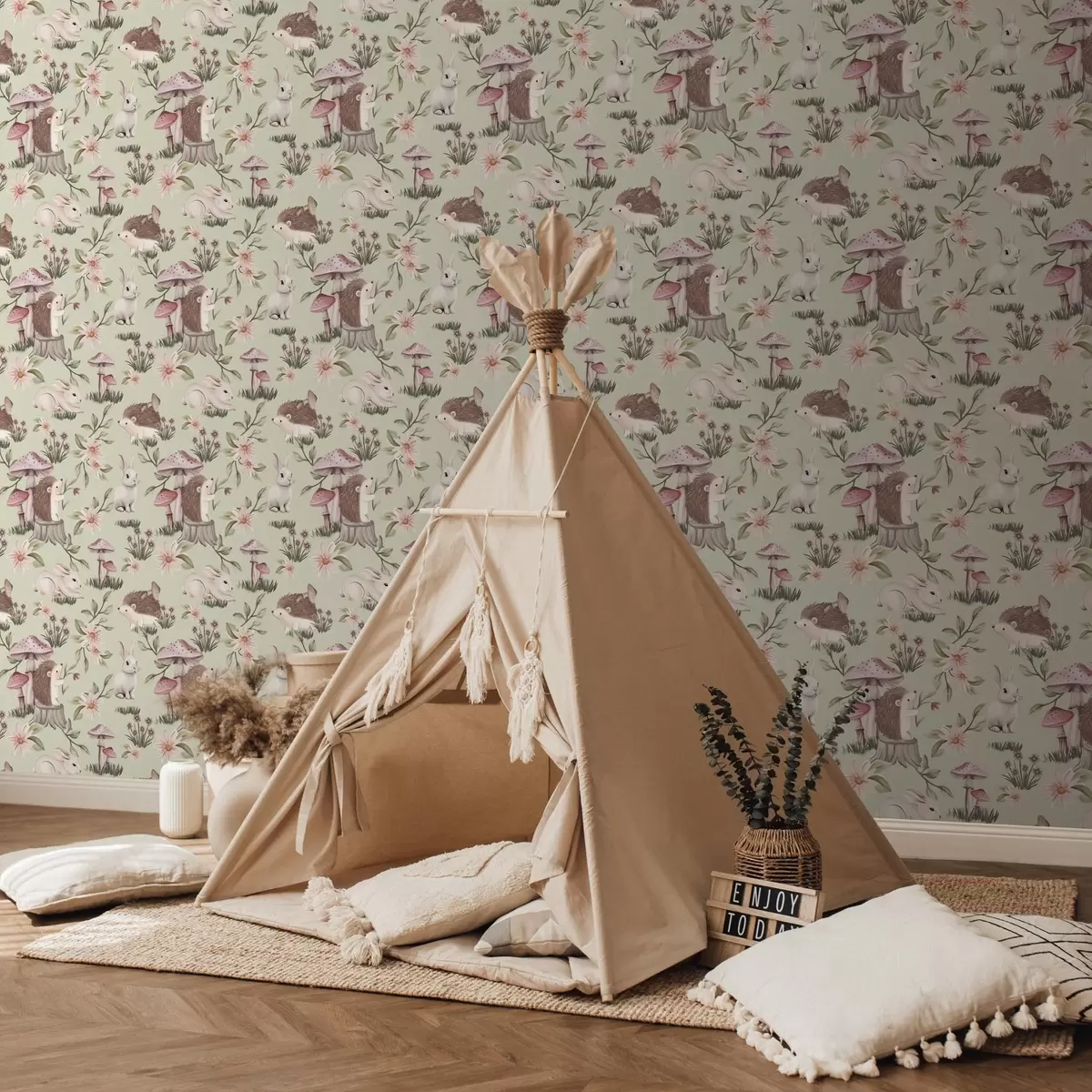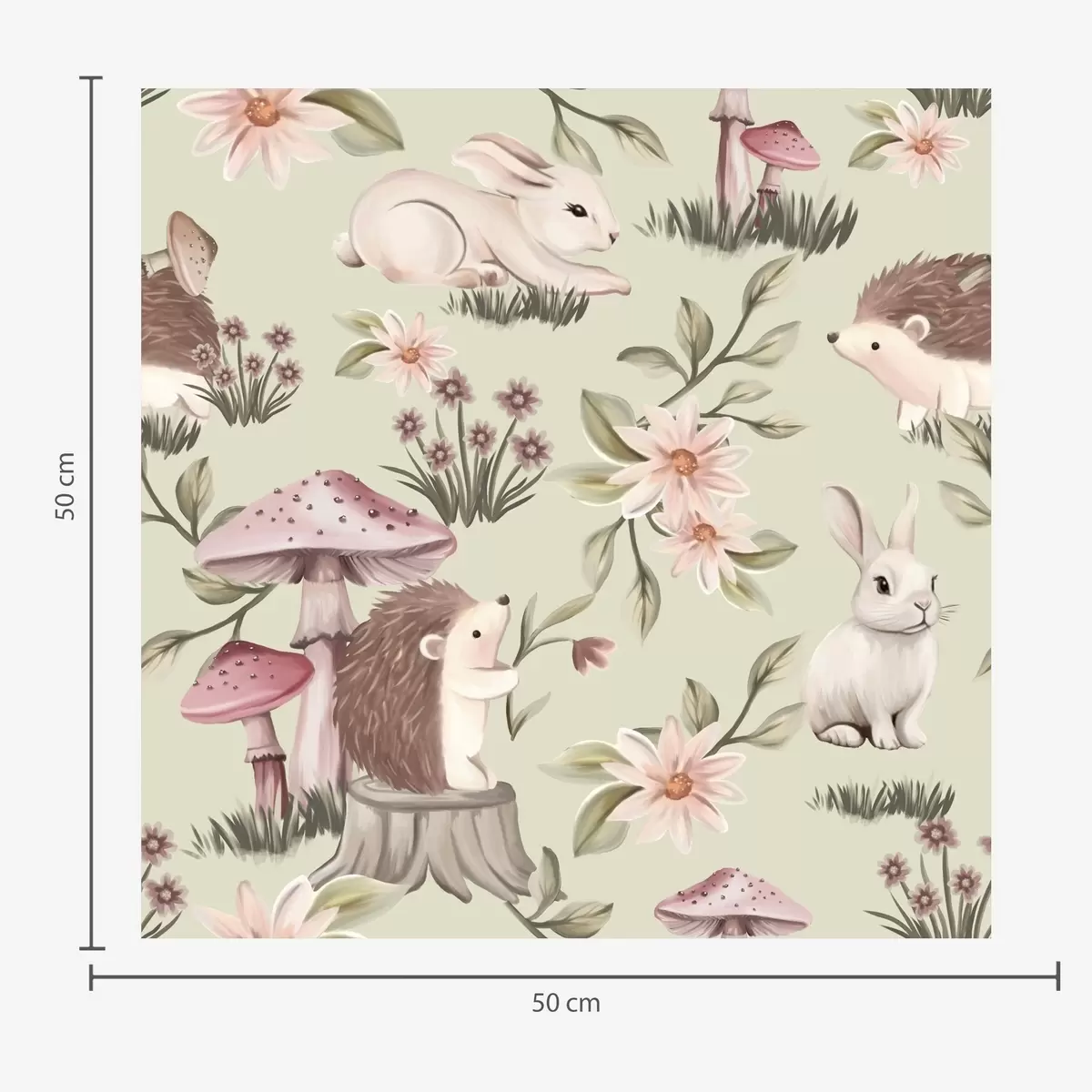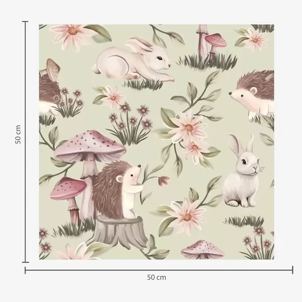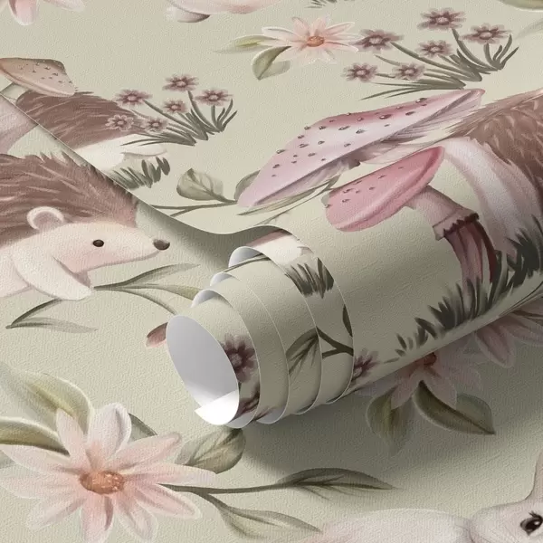 Papel de parede Animais e flores de contos de fadas sobre um fundo verde em delicados tons pastel Nr. a00111v1