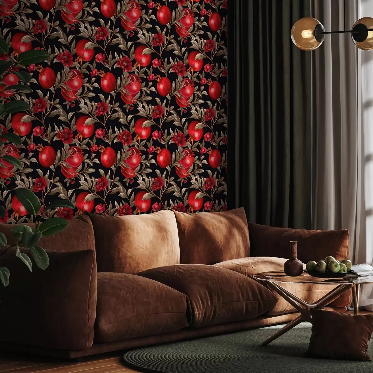 Papel de parede Romãs e flores sobre um fundo escuro em estilo mediterrânico Nr. a00115