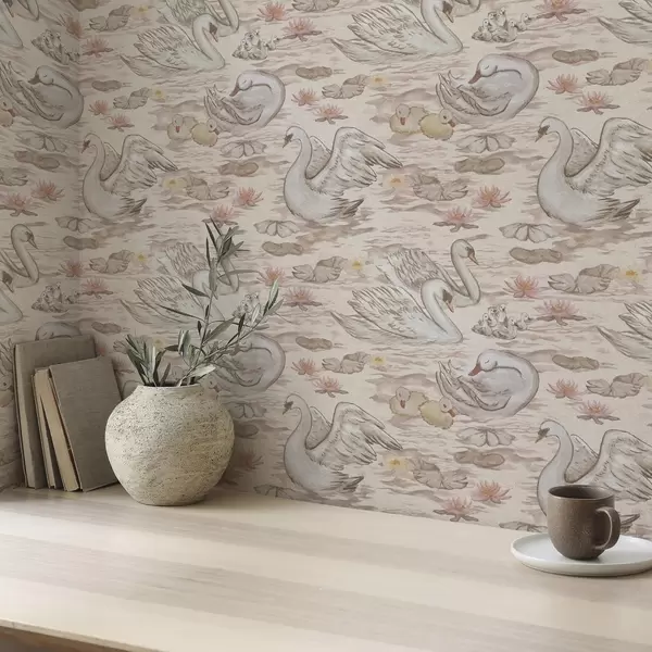 Papel de parede Cisnes com pintos num fundo cor-de-rosa com nenúfares Nr. a00176