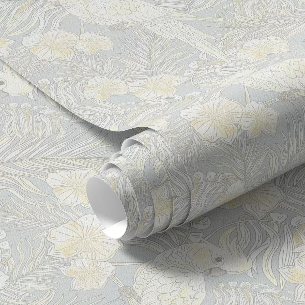Papel de parede Estampado tropical claro com catatuas e flores sobre um fundo azul Nr. a00203