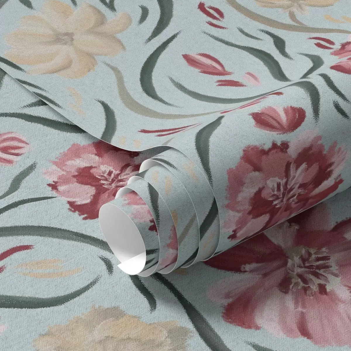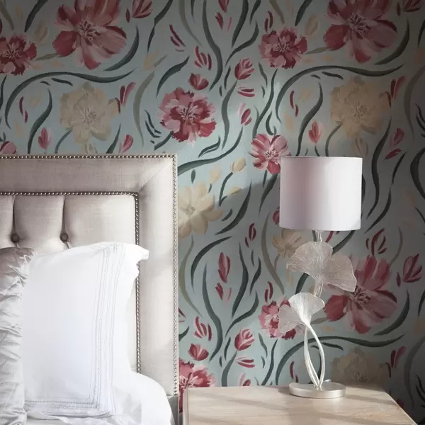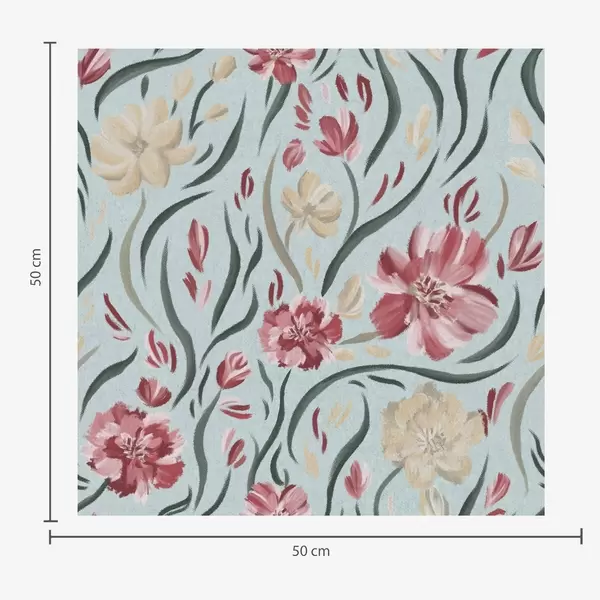 Papel de parede Flores em aguarela sobre um fundo azul, padrão vermelho e bege Nr. a00216