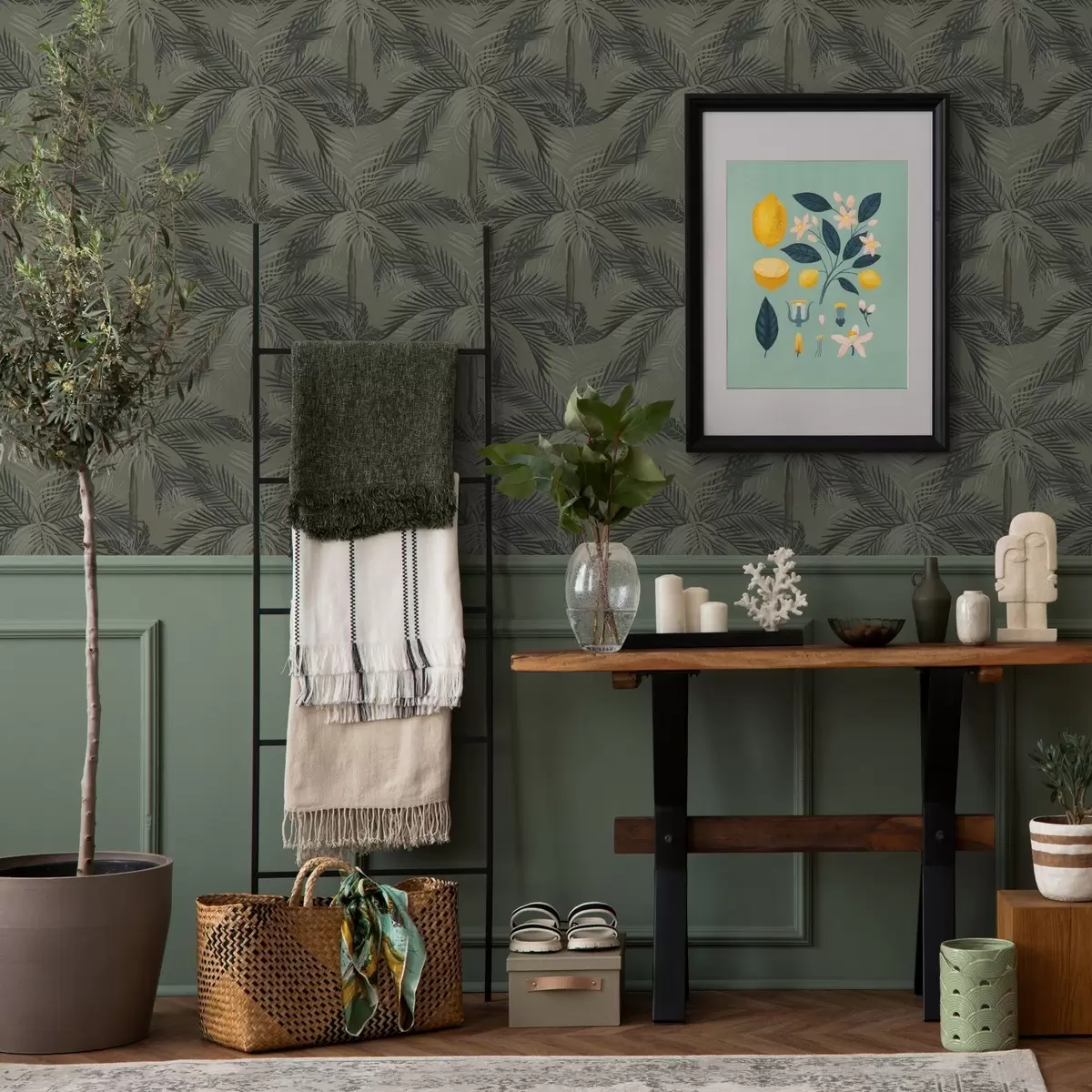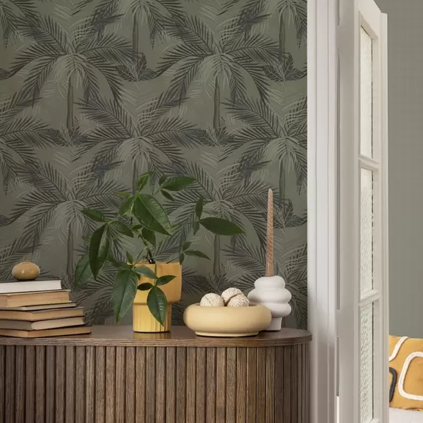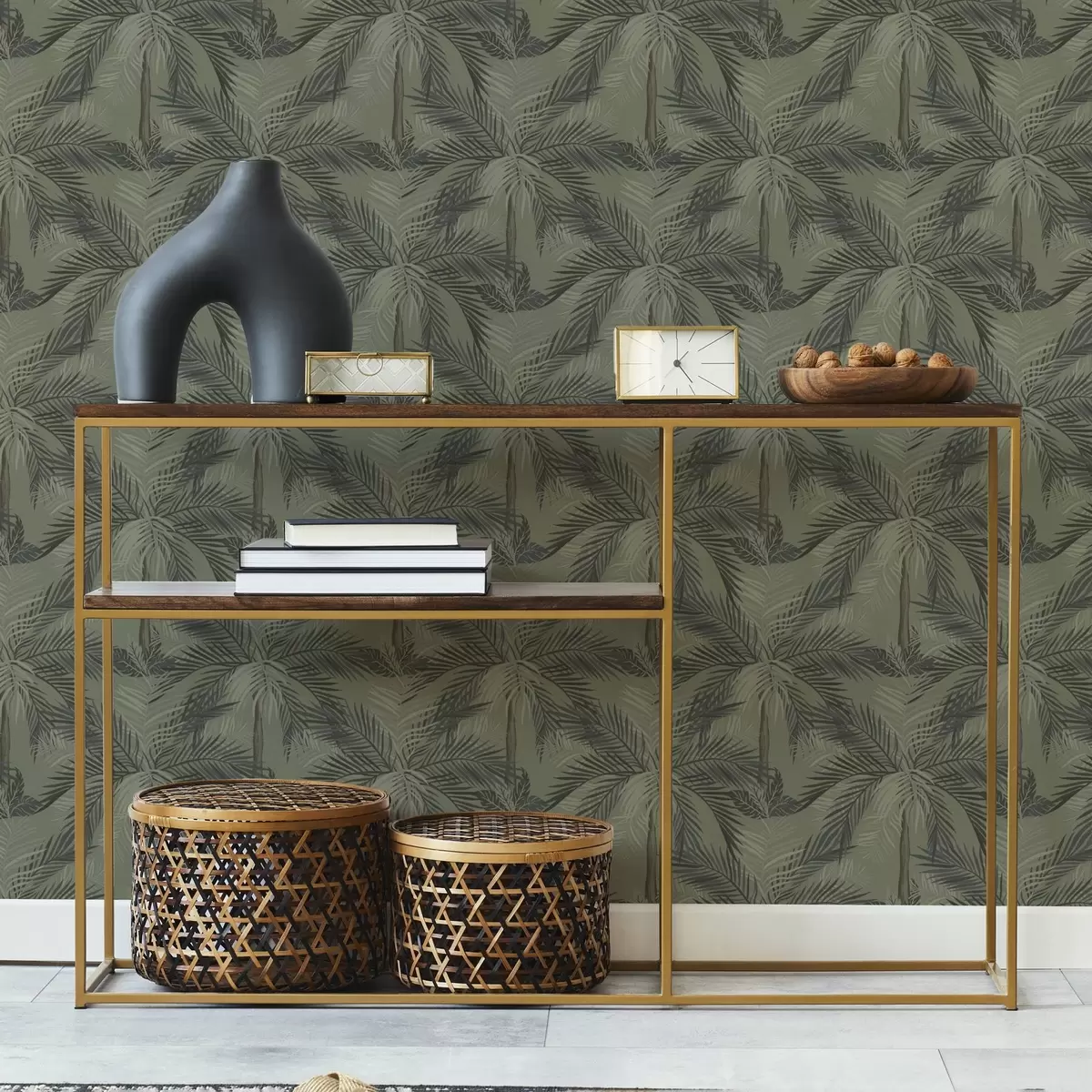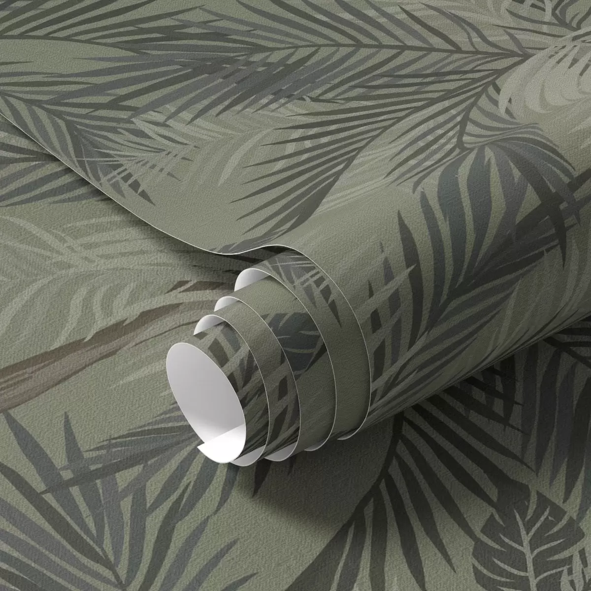 Papel de parede Folhas de palmeira sobre fundo de oliveira, selva, trópicos Nr. a00217