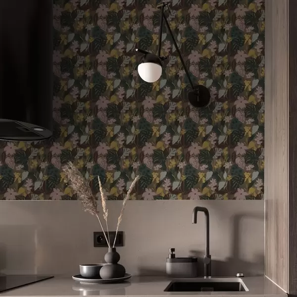 Papel de parede Folhas e flores tropicais escuras numa pintura densa pintura densa Nr. a00244