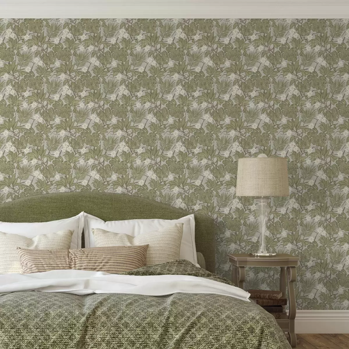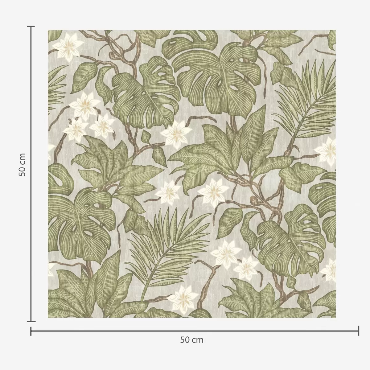Papel de parede Folhas e flores de monstera tropical sobre um fundo cinzento Nr. a00249