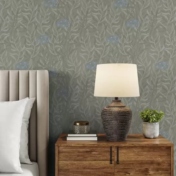 Papel de parede Fundo verde com ramos brancos e flores azuis Nr. a00268v1