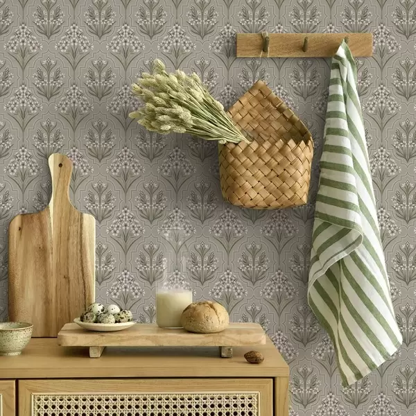 Papel de parede Padrão simétrico com flores brancas sobre um fundo cinzento Nr. a00302