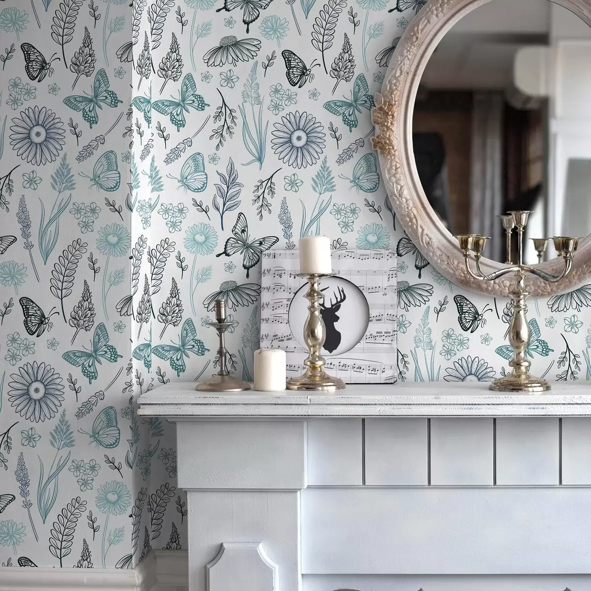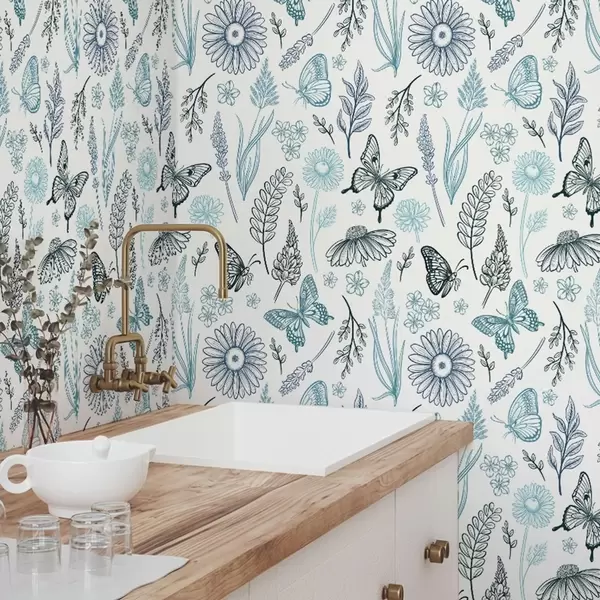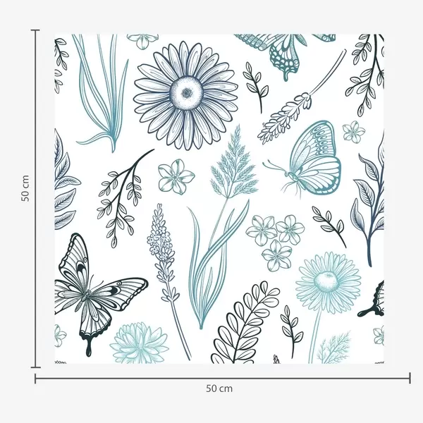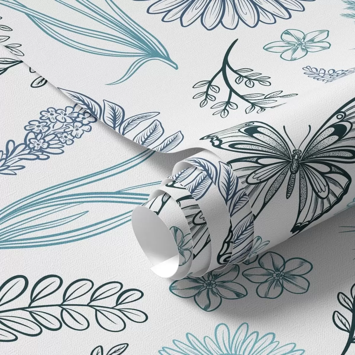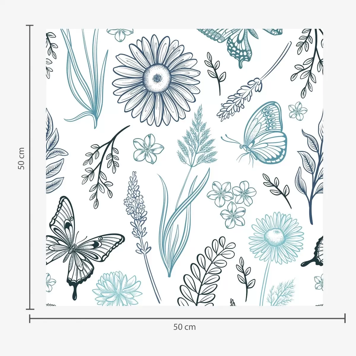 Papel de parede Contorno de borboletas e flores em tons de azul e azul Nr. a00311