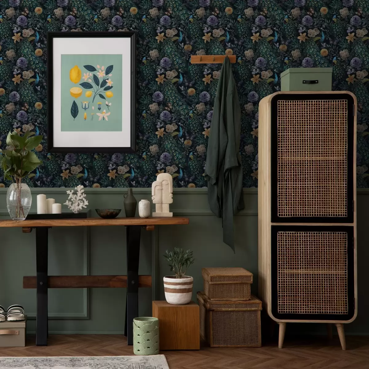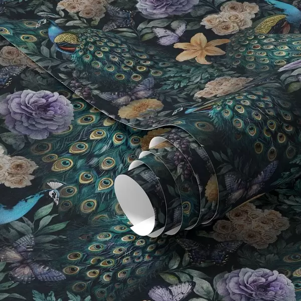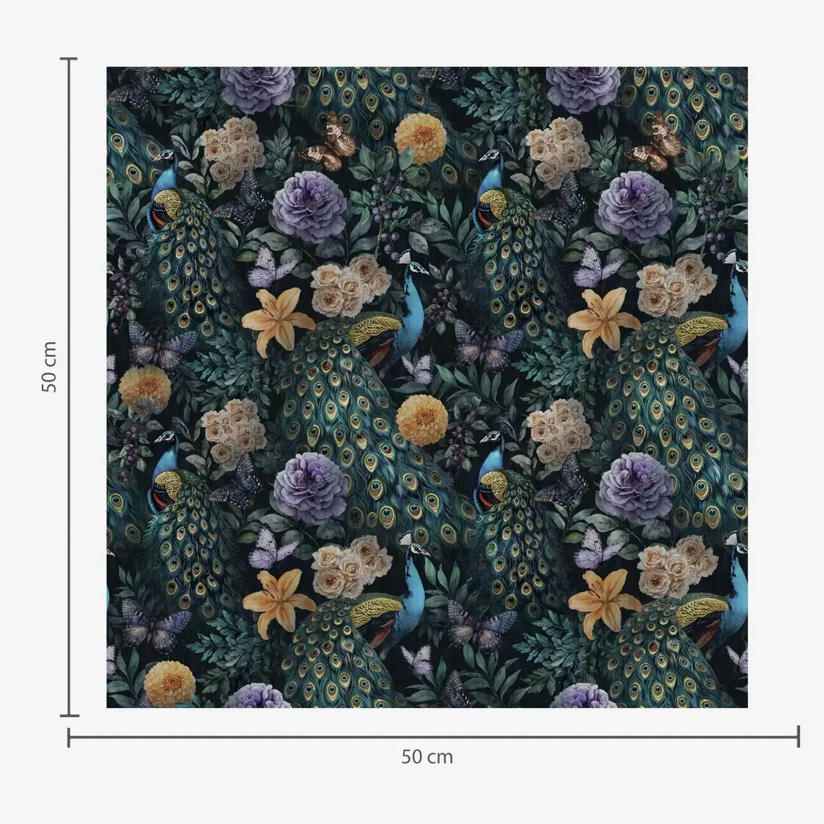 Papel de parede Pavões entre flores escuras e borboletas Nr. a00348