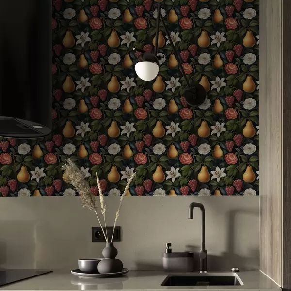 Papel de parede Frutos e flores barrocos sobre um fundo escuro dramático Nr. a00387