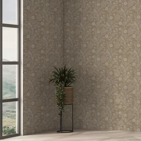 Papel de parede Esboço delicado de um pássaro branco e de uma flor pássaro branco e flor sobre fundo ocre Nr. a00393