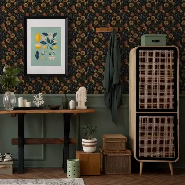 Papel de parede Frutas e flores amarelas sobre fundo botânico escuro Nr. a00395