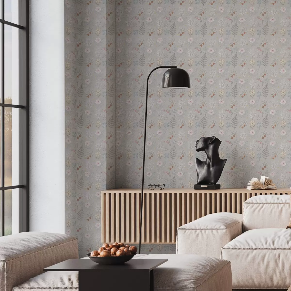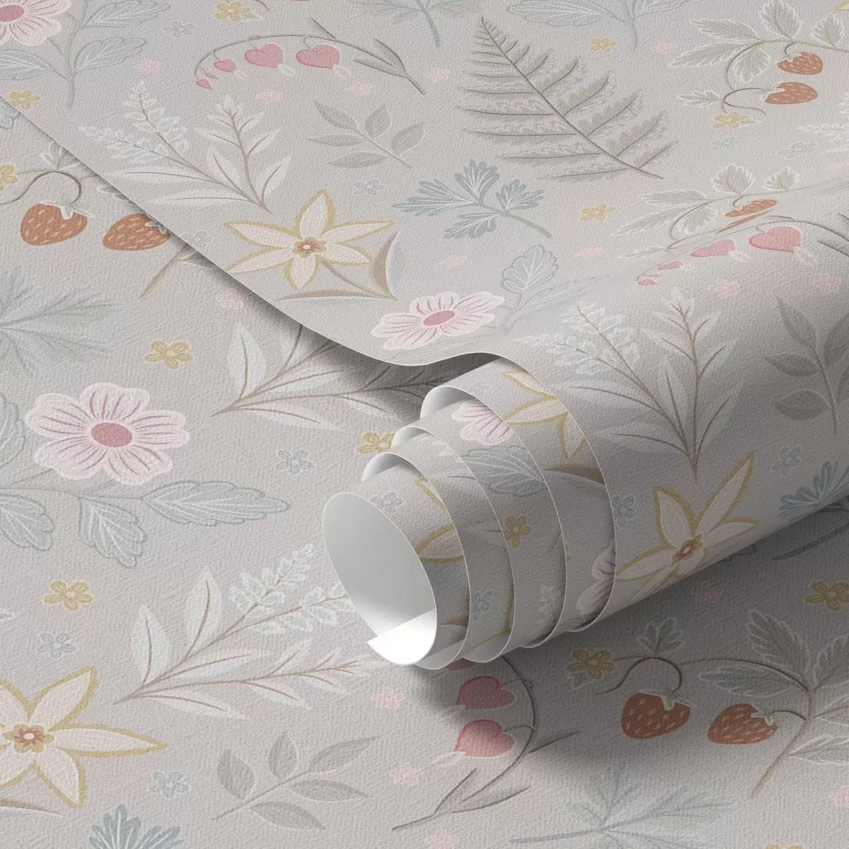 Papel de parede Flores e bagas em tons pastel sobre um fundo cinzento claro Nr. a00406