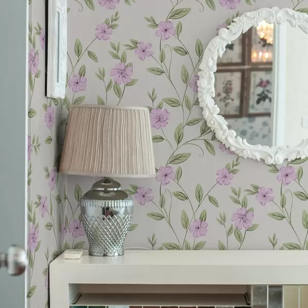 Papel de parede Flores cor-de-rosa com trepadeiras verdes sobre um fundo creme Nr. a00453