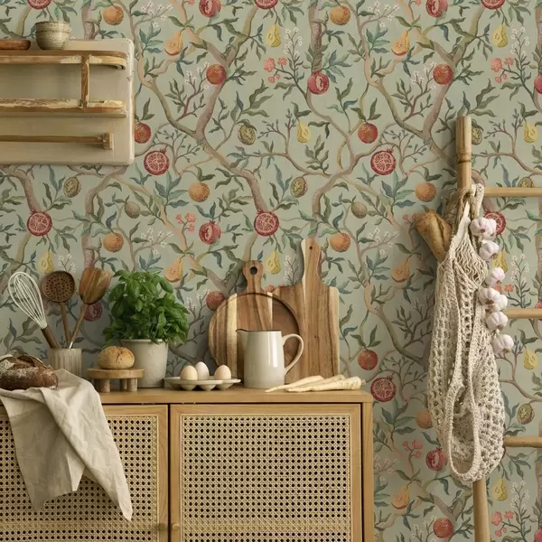 Papel de parede Frutos de romã, pêras e flores sobre um fundo verde claro Nr. a00465