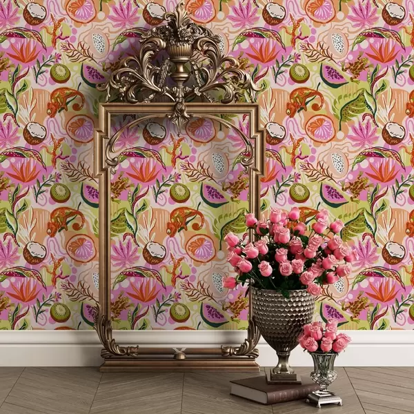 Papel de parede Frutos exóticos, folhas e camaleões num estilo tropical Nr. a00469