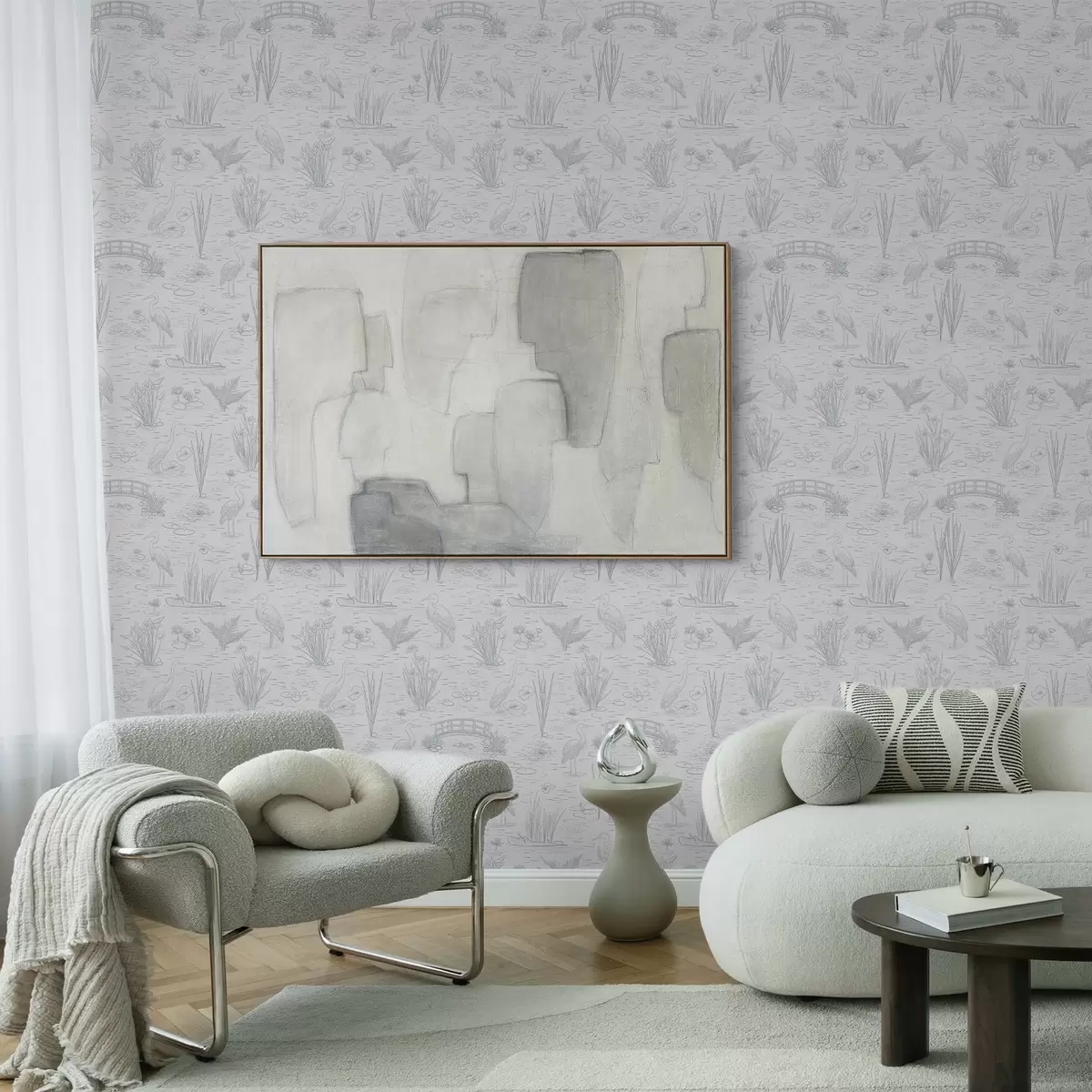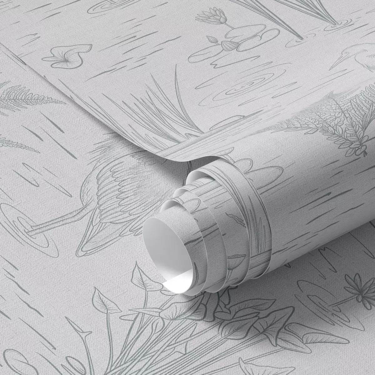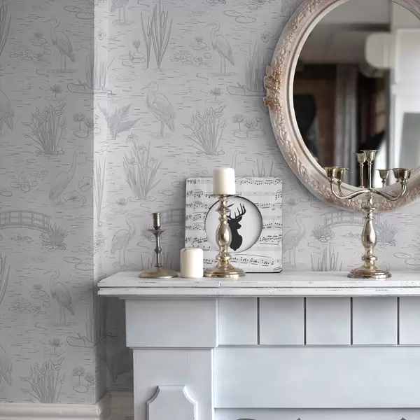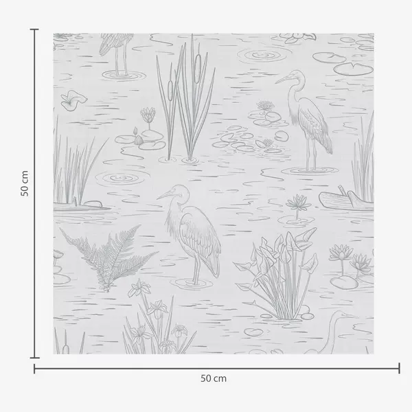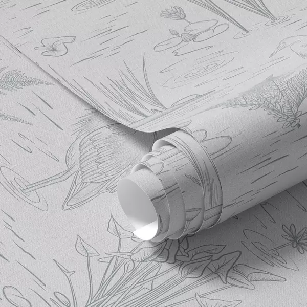 Papel de parede Desenho de garças e plantas aquáticas em tons de cinzento calmos Nr. a00479